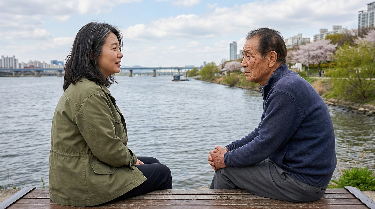 한 시간 뒤, 두 사람은 마포 강변 벤치에 앉았다. 한강이 봄빛으로 반짝였다.
