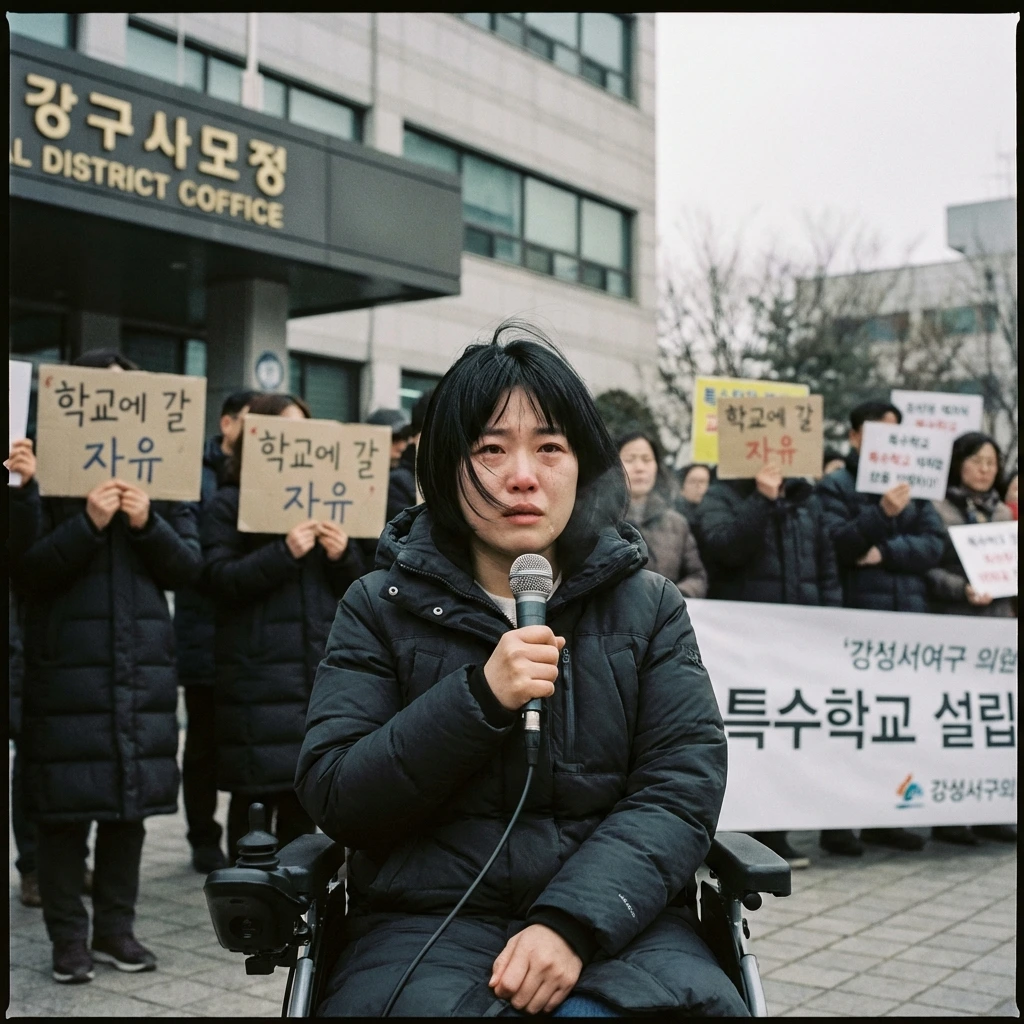 공청회장. 학부모들이 무릎을 꿇었다. 장애아동 부모들이 주민들 앞에서, 카메라 앞에서, 무릎을 꿇었다. 내 아이가 학교에 다닐 수 있게 해달라고.