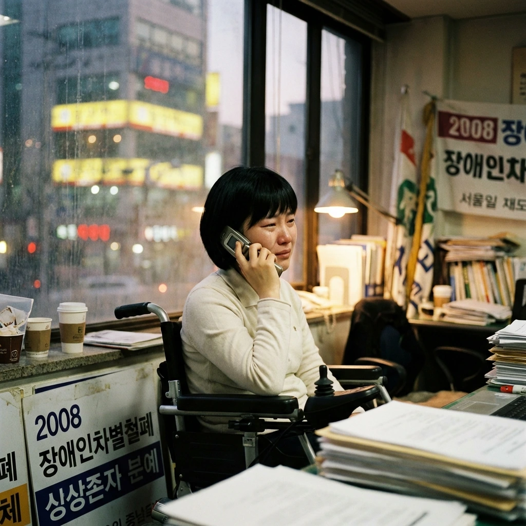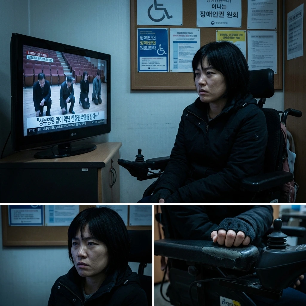 도아는 그 장면을 뉴스로 보았다. 전동 휠체어 위에서. 화면 속 어머니들이 바닥에 무릎을 꿇었다. 눈물을 흘렸다. 손을 모았다.