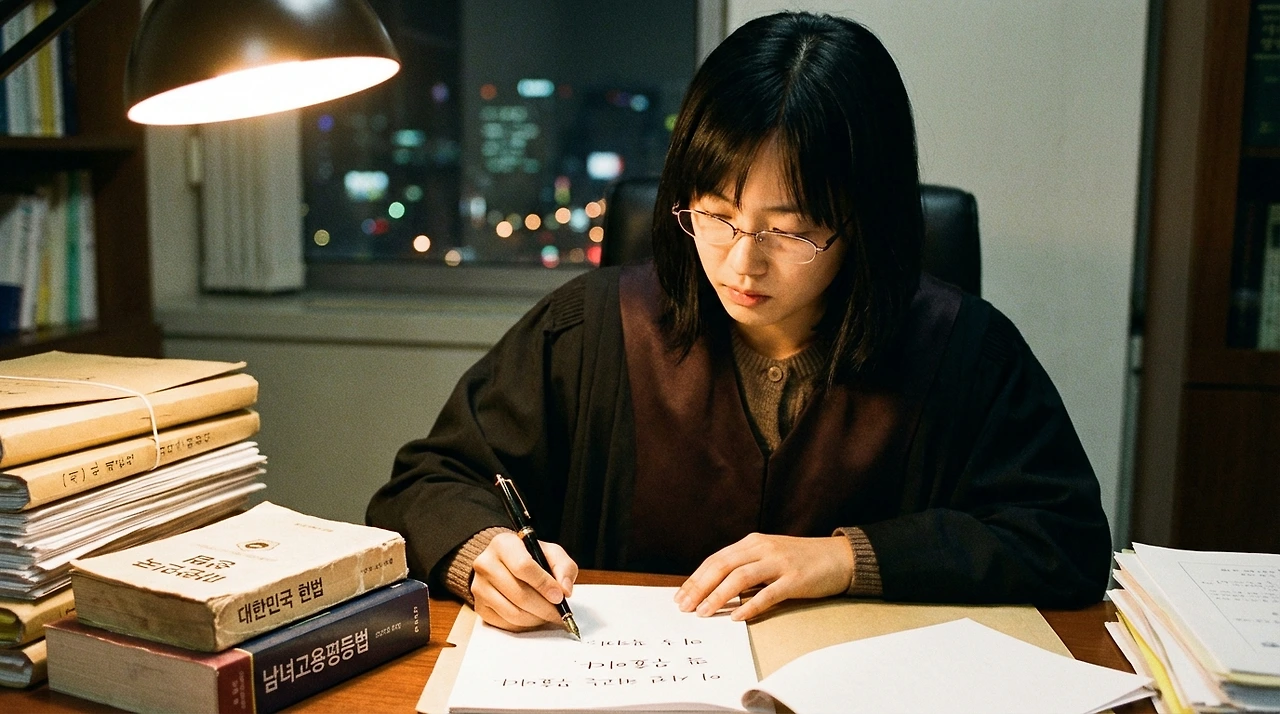 판결을 쓰는 날 밤, 수현은 연구실에 혼자 남아 법전을 폈다. 헌법 제11조. 모든 국민은 법 앞에 평등하다. 누구든지 성별에 의하여 차별을 받지 아니한다. 그리고 남녀고용평등법. 사용자는 근로자의 임신·출산을 이유로 해고하거나 불이익한 처우를 하여서는 아니 된다.