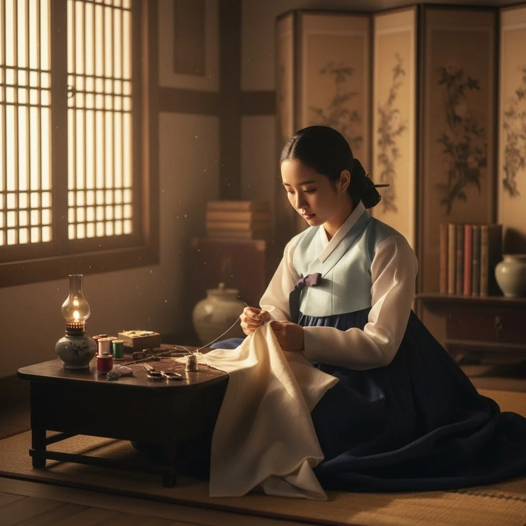 해가 서산으로 기울어갈 무렵, 지영은 자신의 방에서 바느질을 하고 있었다.