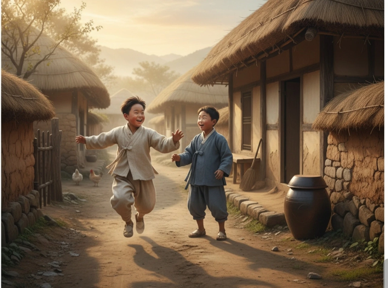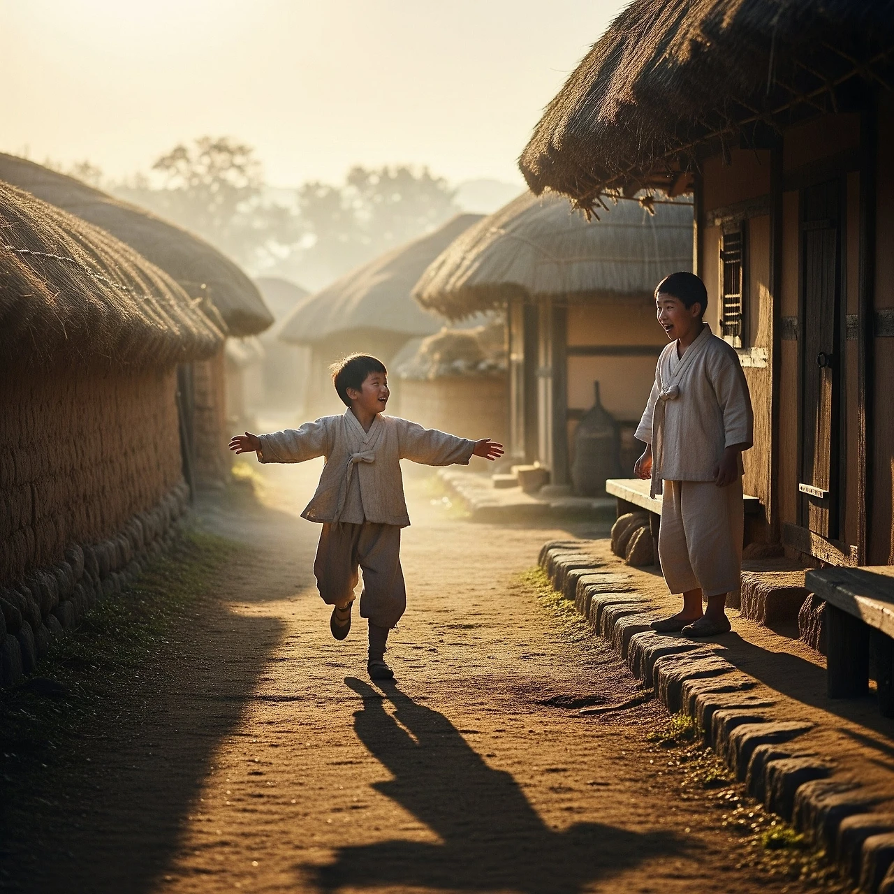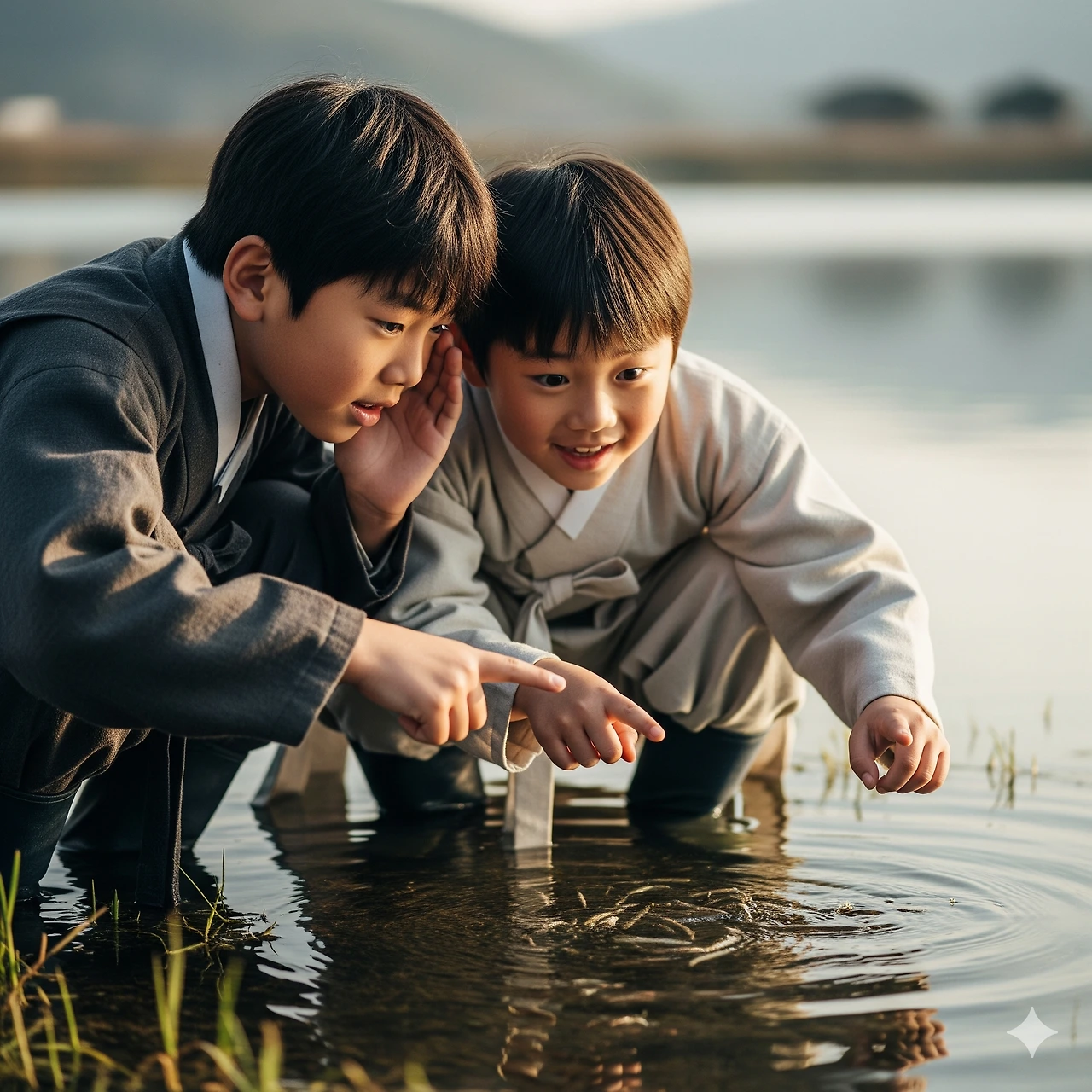 저수지 수문 아래는 이미 동네 아이들로 북적였다. 물살이 콸콸 흘러내리는 소리와 아이들의 웃음소리가 어우러져 한낮의 정적을 깨뜨렸다."야, 사 갑이! 정치야! 여기로 와!" 먼저 와있던 마을 아이들이 손을 흔들며 소리쳤다."어서 와! 오늘 물고기가 엄청 많아!" 동년배 아이 하나가 진흙투성이 손으로 두 사람을 부르며 말했다.