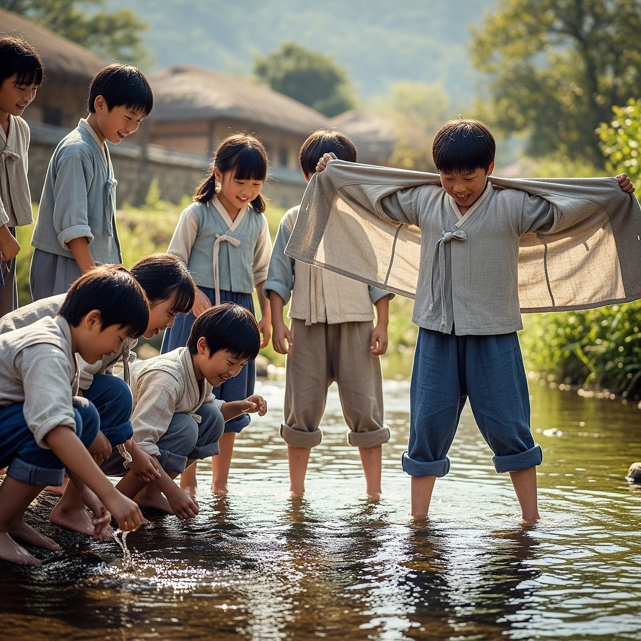 순갑이와 정치는 서로 눈을 마주치며 씩 웃더니, 옷자락을 걷어 올리고 조심스럽게 물가로 내려갔다. 수문에서 떨어지는 물줄기가 만든 웅덩이에는 정말로 작은 물고기들이 헤엄치고 있었다."저기 봐! 저 큰 놈!" 정치가 손가락으로 가리키며 흥분해서 말했다."어디? 어디?" 순갑이가 몸을 앞으로 구부리며 물속을 들여다보았다."아, 도망갔네!" 한 아이가 아쉬워하며 말했다."괜찮아, 또 있을 거야!" 다른 아이가 웃으며 답했다. 아이들은 각자 나름의 방법으로 물고기를 잡기 시작했다.
