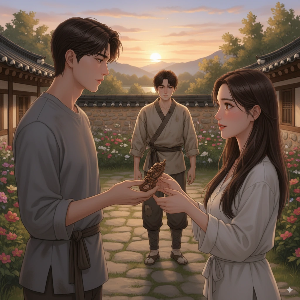 "소저님께서... 소저님께서 기침을 많이 하시는 것 같아서... 이것을 목에 차시면 기침에 도움이 된다고 합니다." 정치가 조심스럽게 내밀었다.서영은 정치의 진심어린 마음을 느낄 수 있었다. 비록 신분은 다르지만 그의 순수한 마음에 감동했다."고마워요. 정성이 느껴져요." 서영이 부드럽게 말하며 장신구를 받았다.정치의 얼굴에 환한 미소가 피어올랐다. 하지만 그 순간 산갑이가 나타났다."서영 양, 여기 계셨군요." 산갑이가 다가오며 정치를 발견했다. "정치야, 무슨 일이냐?""아... 아무것도 아닙니다, 도련님." 정치가 황급히 고개를 숙였다.산갑이는 서영의 손에 들린 나무 장신구를 보고 눈썹을 찌푸렸다."이것은 뭐냐?" 산갑이가 차가운 목소리로 물었다."정치가... 제 건강을 걱정해서 만들어준 것이에요." 서영이 조심스럽게 말했다. 순갑이의 마음에 묘한 질투심이 일어났다. 정치가 서영에게 관심을 보이는 것이 불쾌했다."정치야, 네가 서영 양께 함부로 접근하는 것은 적절하지 않다." 산갑이 엄한 목소리로 말했다. 정치는 고개를 더욱 깊이 숙였다. 자신의 감정이 얼마나 무모한 것인지를 깨달았다."죄송합니다, 도련님." 정치가 작은 목소리로 말하고는 그 자리를 떠났다. 서영은 정치의 뒷모습을 안쓰럽게 바라보았다. 그의 순수한 마음을 알 수 있었기에 더욱 마음이 아팠다. "산갑 도련님, 너무 하신 것 아니에요? 그분은 그저 친절을 베푼 것뿐인데..." 서영이 조심스럽게 말했다. 산갑이는 자신의 질투심을 드러낸 것을 후회했다. 하지만 서영을 향한 자신의 마음이 이렇게 강할 줄은 몰랐다."죄송합니다, 서영 양. 제가 너무 성급했습니다." 선갑이가 미안해하며 말했다. 한편 정치는 혼자 저수지 근처로 가서 깊은 한숨을 쉬었다.