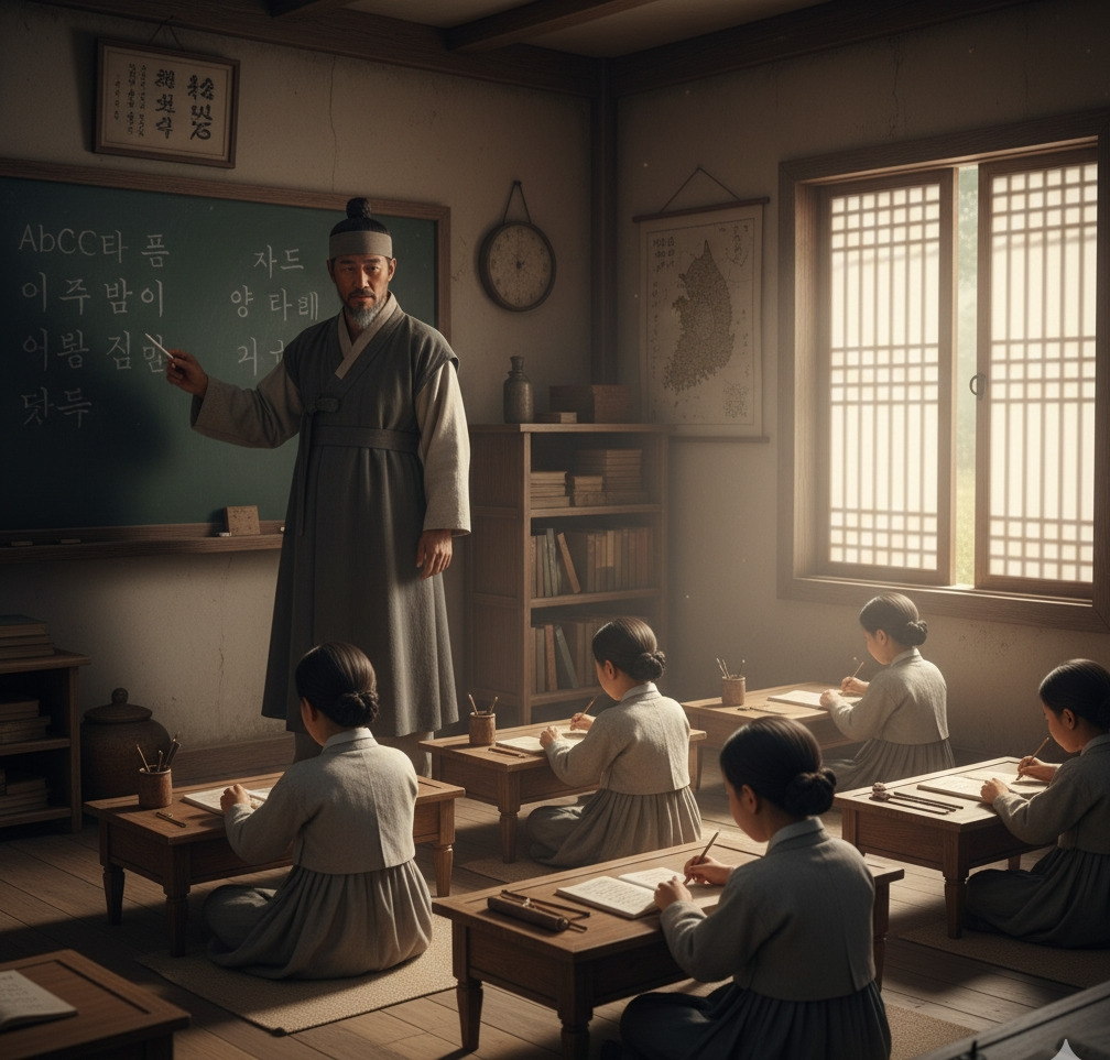 그의 눈빛은 비록 슬픔을 담고 있었으나, 아이들을 향한 따뜻함과 미래에 대한 희망을 잃지 않았다. 칠판에는 한글이 쓰여 있었고, 아이들은 진지한 얼굴로 우리말을 배우고 있었다.