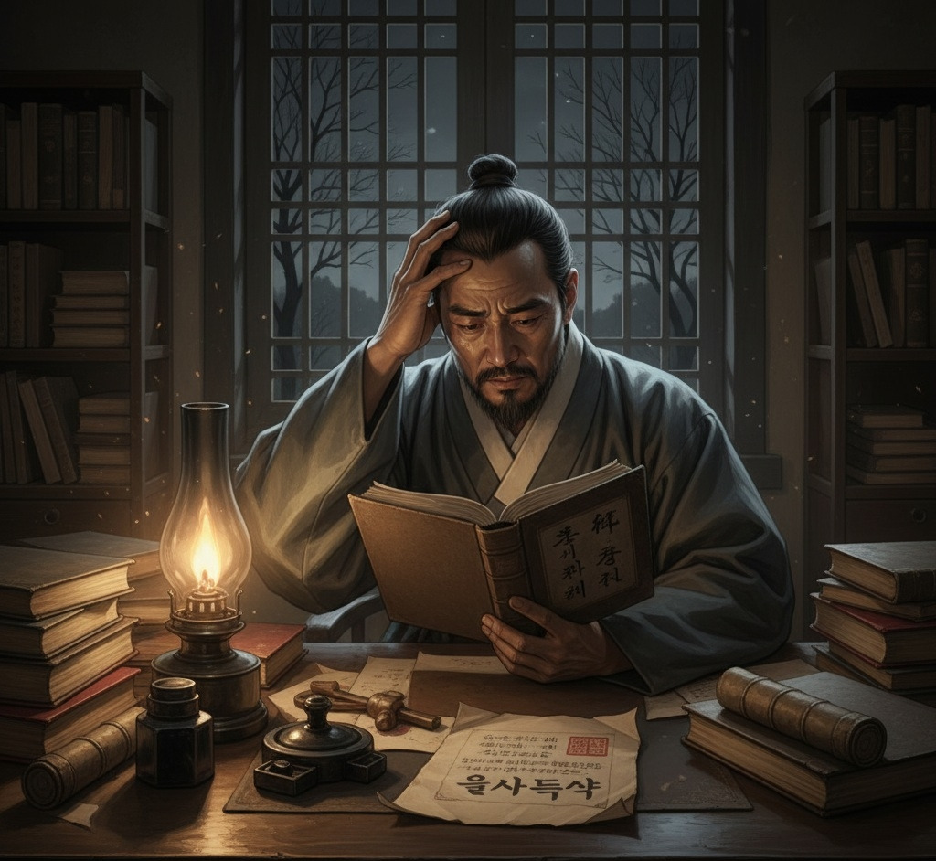 그는 자신의 서재에서 홀로 등잔불 아래 앉아 고뇌했다. 책상 위에는 '을사늑약'이라 적힌 종이가 놓여 있었고, 그의 얼굴에는 깊은 번민과 슬픔이 깃들어 있었다.