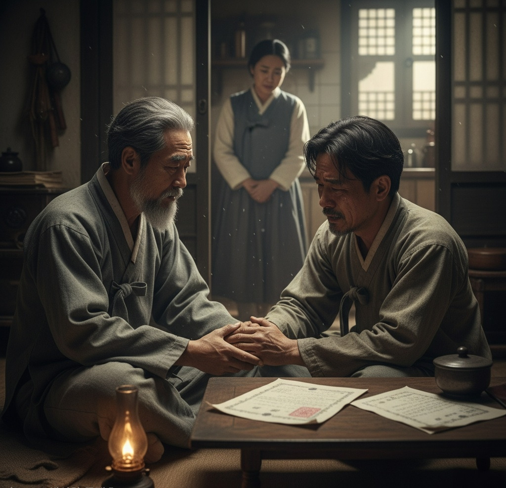그의 얼굴에는 세월의 흔적과 고뇌가 깊게 새겨져 있었지만, 백성을 향한 따뜻한 마음과 굳은 의지는 변함이 없었다. 아내 지영은 물러나 서서 그 모습을 조용히 지켜보고 있었다. 등잔불이 은은하게 비추는 방 안에는 농민의 슬픔과 이충헌의 연민이 함께 스며들어 있었다.