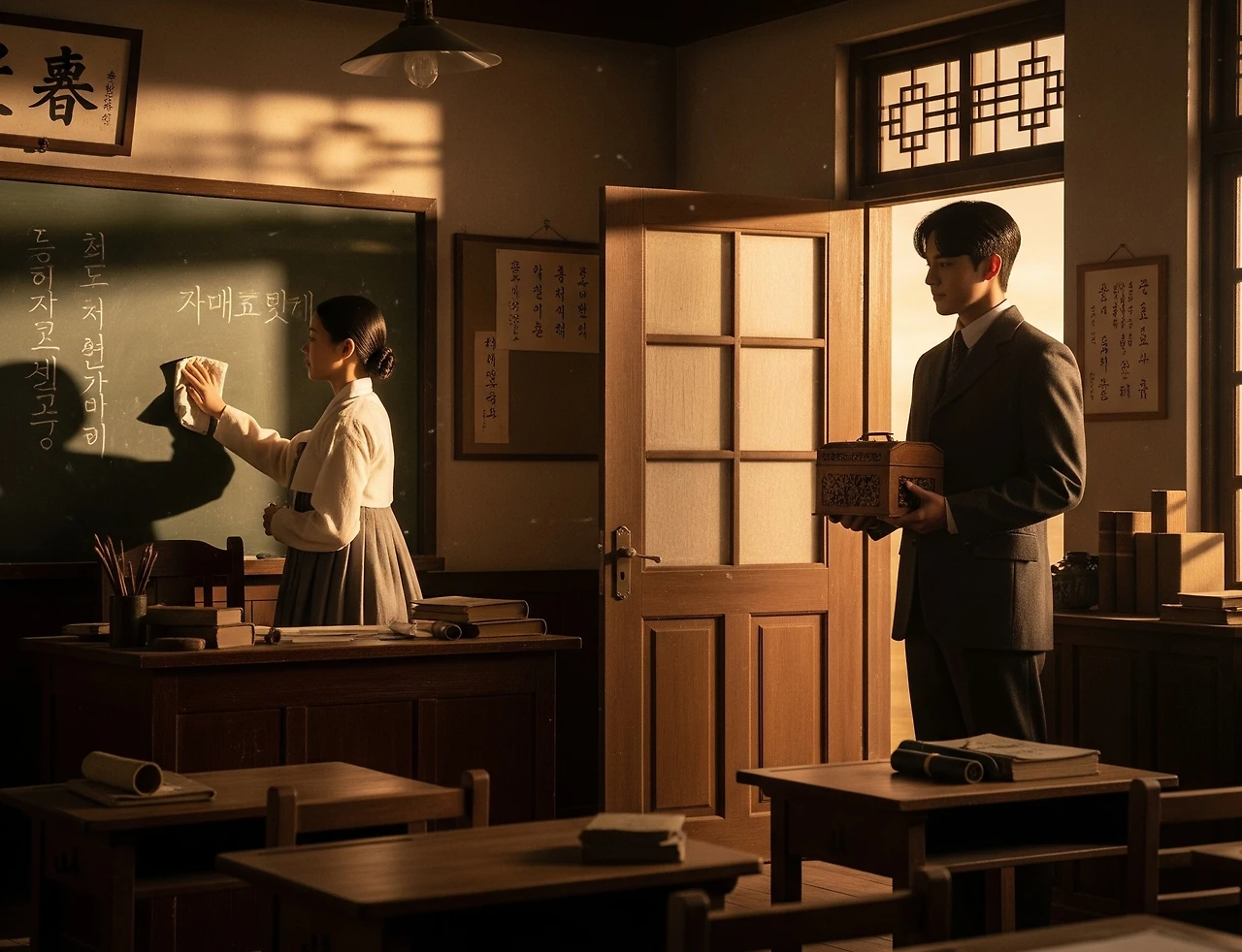 서영은 아이들이 쓰던 칠판을 닦고 있었고, 산갑은 그런 그녀를 바라보며 가슴이 벅찼다."서영 양." 산갑이 불렀다.서영이 돌아보자, 산갑은 작은 상자를 꺼냈다. 그 안에는 소박하지만 정성스럽게 준비한 은반지가 들어있었다."이게... 뭔가요?" 서영이 놀라며 물었다."제 마음입니다." 산갑이 진지하게 말했다. "비록 지금은 혼란한 시대이고, 우리 앞길이 어떻게 될지 모르지만... 저는 당신과 함께 그 길을 걷고 싶습니다.