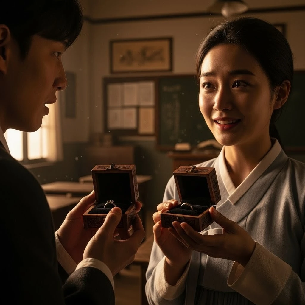 "이것은 제가 직접 만든 거예요."서영의 상자 안에도 소박한 은반지가 들어있었다. 그녀가 밤마다 몰래 만든 것이었다."정말... 정말 저를 받아주시겠어요?" 산갑이 믿을 수 없다는 표정으로 물었다."네, 당신과 함께라면 어떤 어려움도 견딜 수 있을 것 같아요." 서영이 환하게 웃었다.두 사람은 서로의 손에 반지를 끼워주었다. 교실의 따뜻한 석양빛이 두 사람을 감쌌다."이 반지가 우리 사랑의 증표가 되었으면 좋겠어요." 서영이 말했다."그럼요. 이 반지처럼 우리의 사랑도 영원하기를..." 산갑이 서영의 손을 잡으며 말했다.그날 밤, 두 사람은 각자의 집에서 반지를 바라보며 행복한 미소를 지었다. 어려운 현실 속에서도 사랑은 그들에게 희망을 주었다.