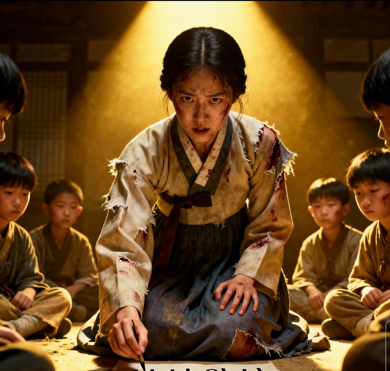 "아직도... 우리 아이들은... 우리 글을 배워야 합니다..."서영의 떨리는 목소리가 백정치의 가슴을 후볐다. 그는 복도 끝으로 걸어가 벽에 머리를 박았다.'내가... 내가 무슨 짓을 한 거야...'밖에서는 비가 내리기 시작했다. 백정치의 마음속에도 후회의 빗방울이 쏟아지고 있었다.