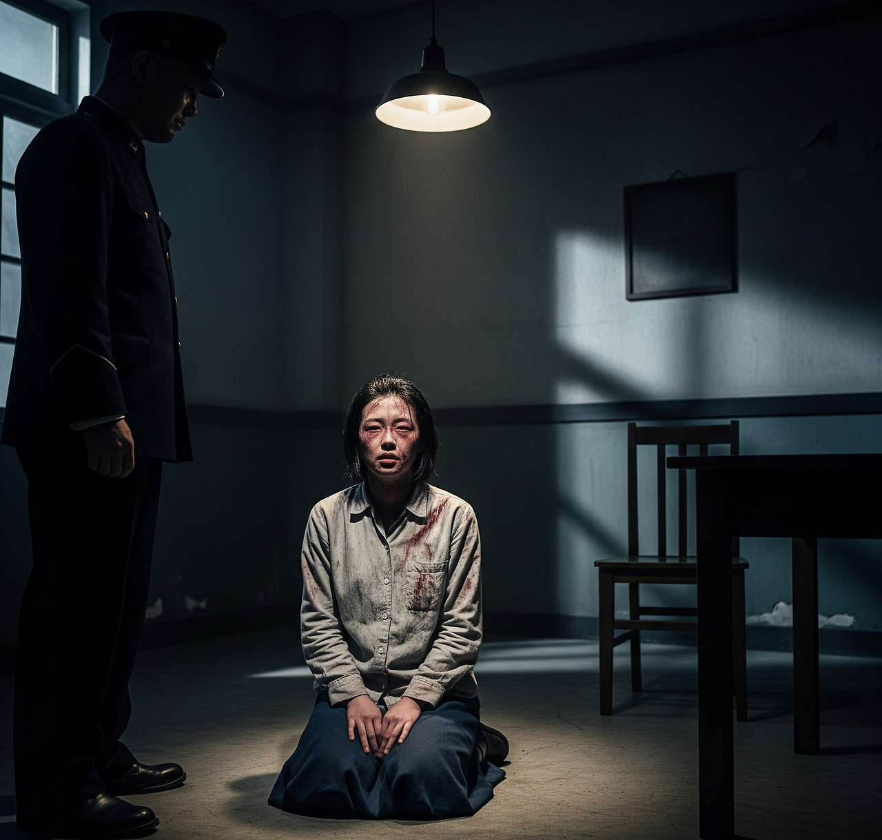 영광 경찰서 지하 취조실. 차가운 콘크리트 바닥에 서영이 무릎을 꿇고 있었다. 며칠째 제대로 먹지 못해 핼쑥해진 얼굴에는 멍 자국들이 선명했다.