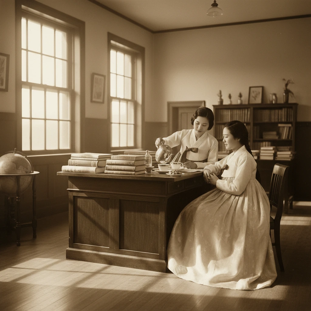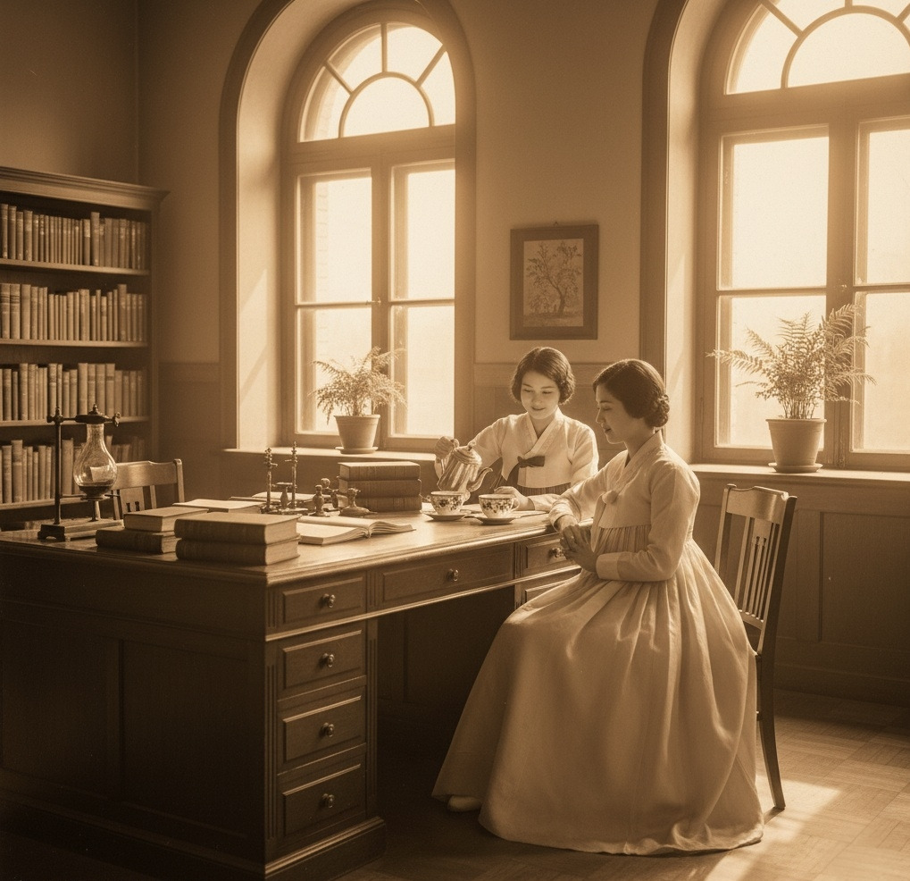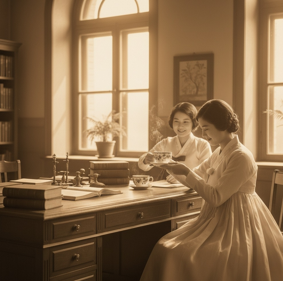창밖으로 경성의 봄 햇살이 들어오는 교수실. 책상 위에는 영양학 서적들과 실험 기록지가 가지런히 놓여 있다. 강지윤이 차를 따르며 이은주에게 건넨다.