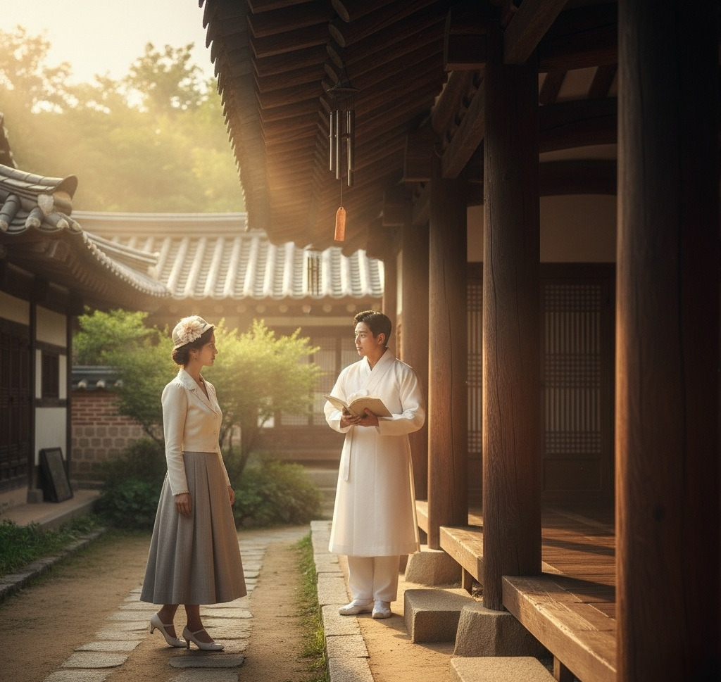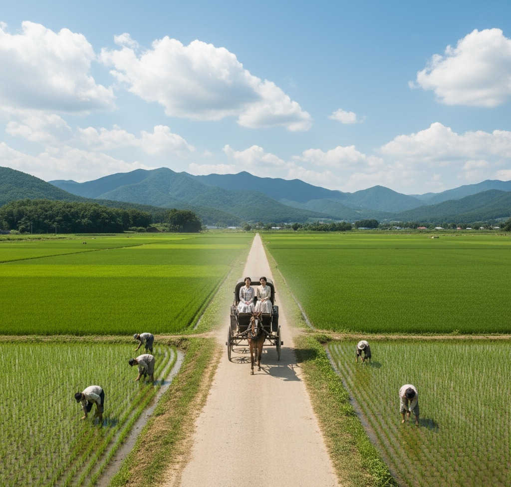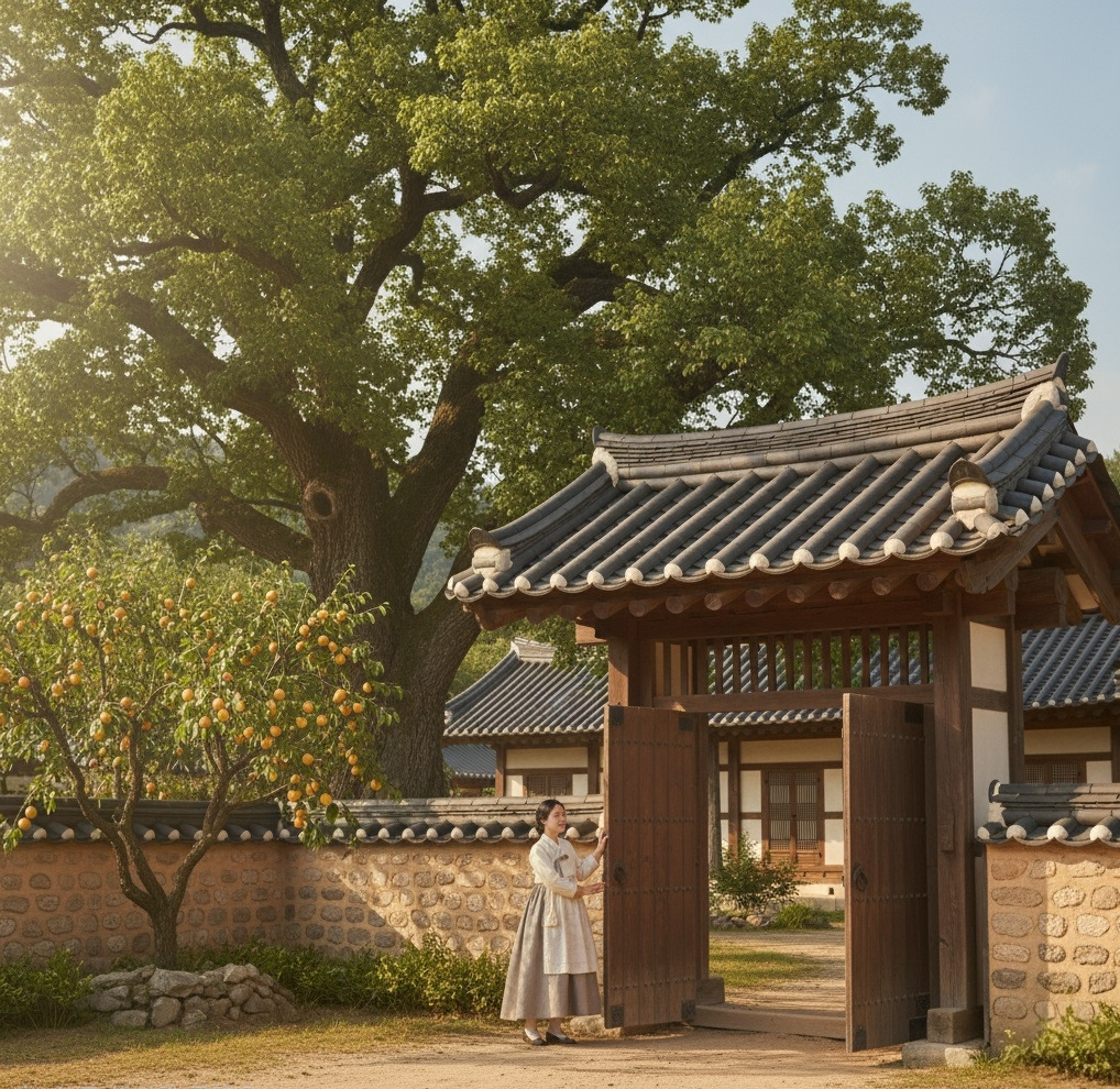마차는 좁은 시골길을 따라 천천히 나아갔다. 이윽고 큰 한옥 기와집 한 채가 보였다. 대문 앞에는 큰 느티나무가 서 있었고, 담장 너머로 살구나무가 보였다.