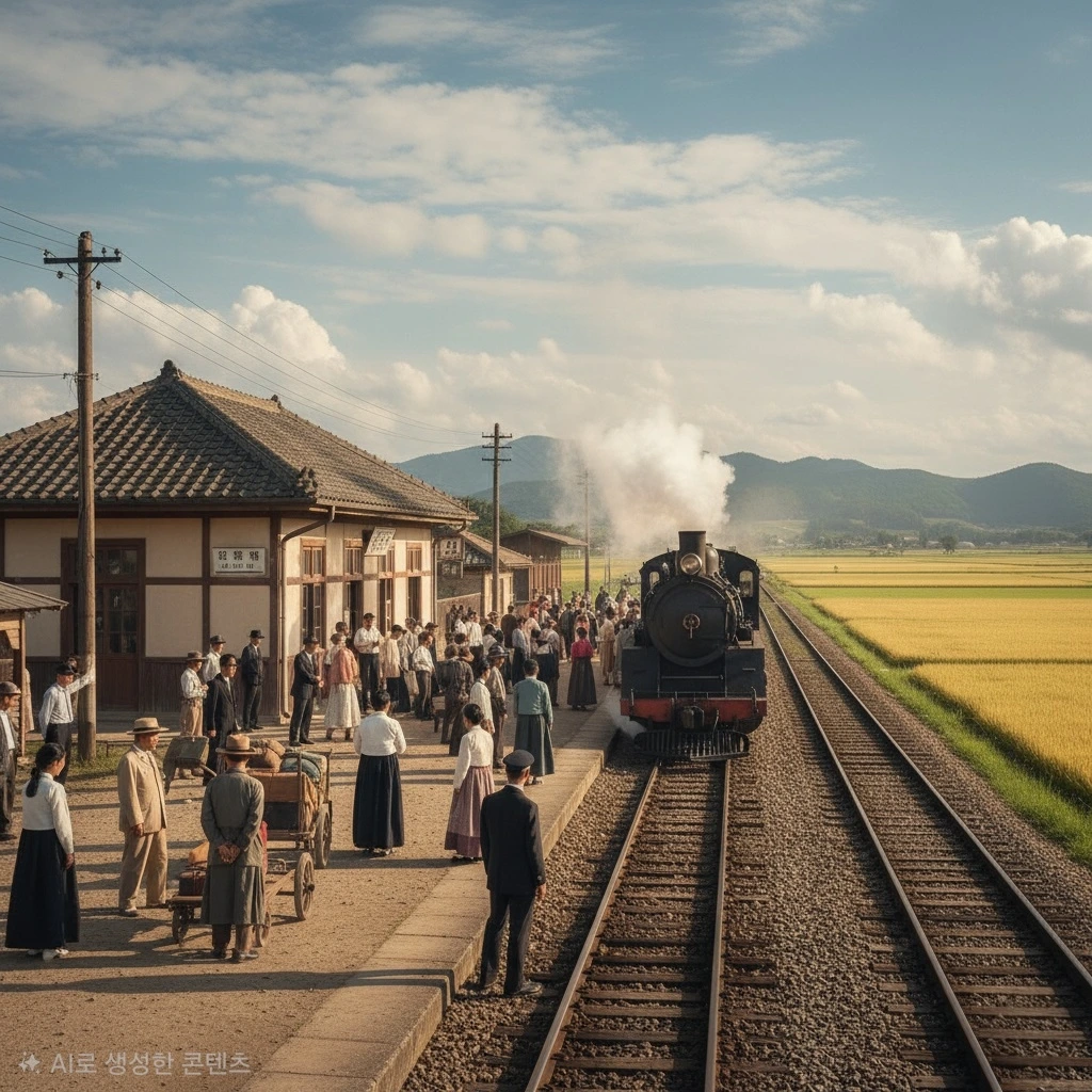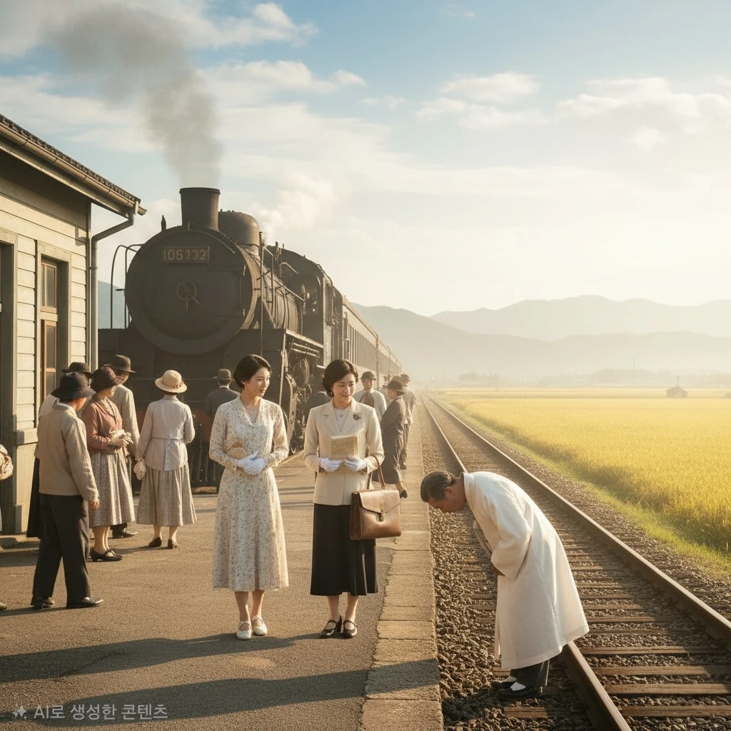 기차가 마침내 송정리 역에 도착했다. 증기가 플랫폼에 가득 퍼지는 가운데, 두 여인은 짐을 들고 내렸다.