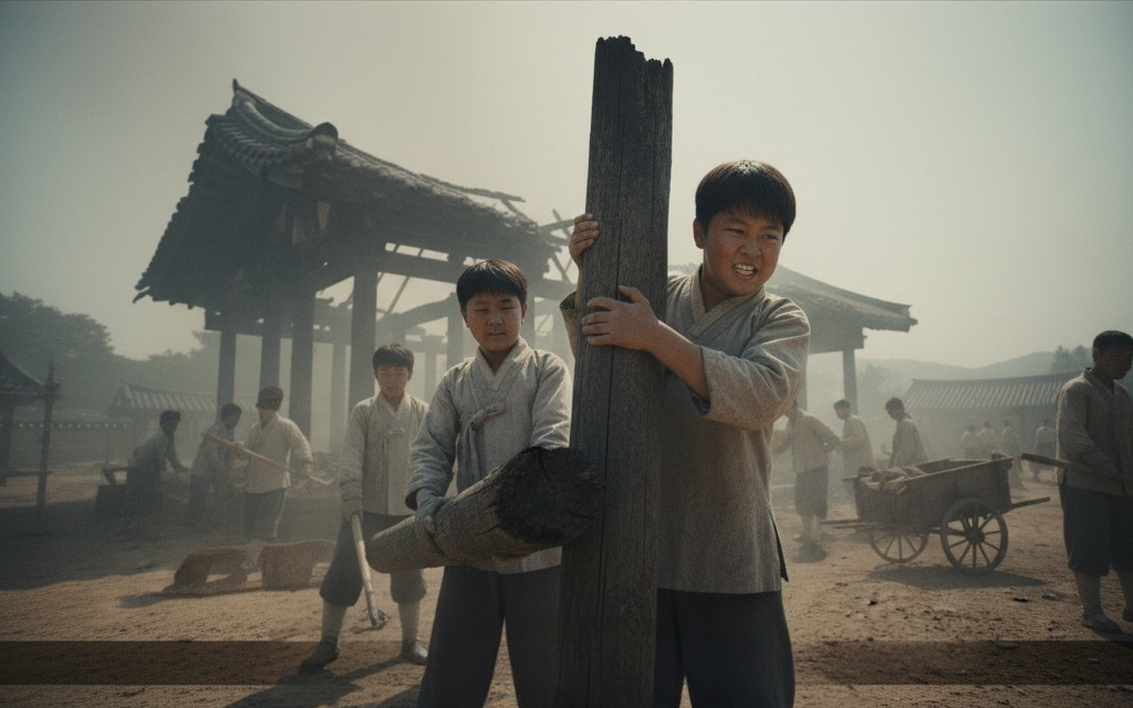 학동 1: (나무 조각을 나르며) "선생님, 이건 어디에 둘까요?"