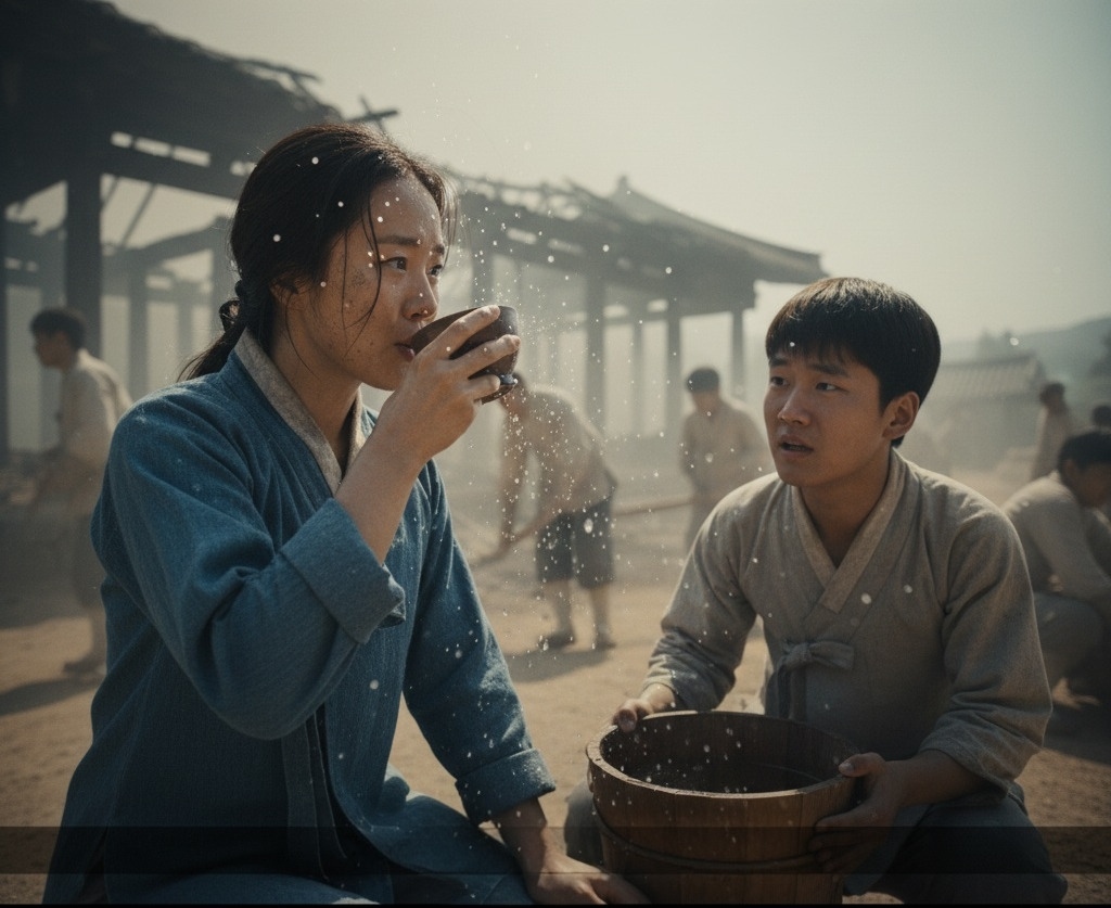 막심이: (물동이를 들고 오며) "아씨, 물 좀 드세요. 더워서 쓰러지시겠어요."