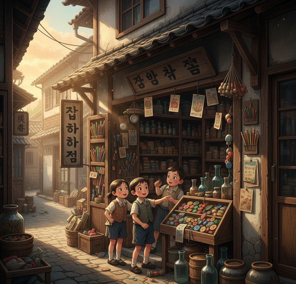손 때 묻은 문구류와 잡동사니가 가득한 잡화점 입구에는, 아이들이 호기심 어린 눈빛으로 널브러진 물건들을 바라보고 있다.