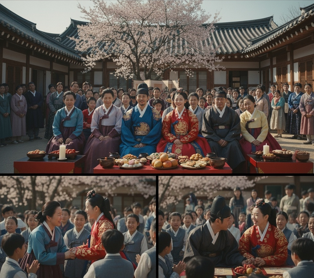 초례가 끝난 후, 마당에서 간단한 피로연이 열렸다. 음식이 나오고, 사람들이 모여 앉아 축하했다.