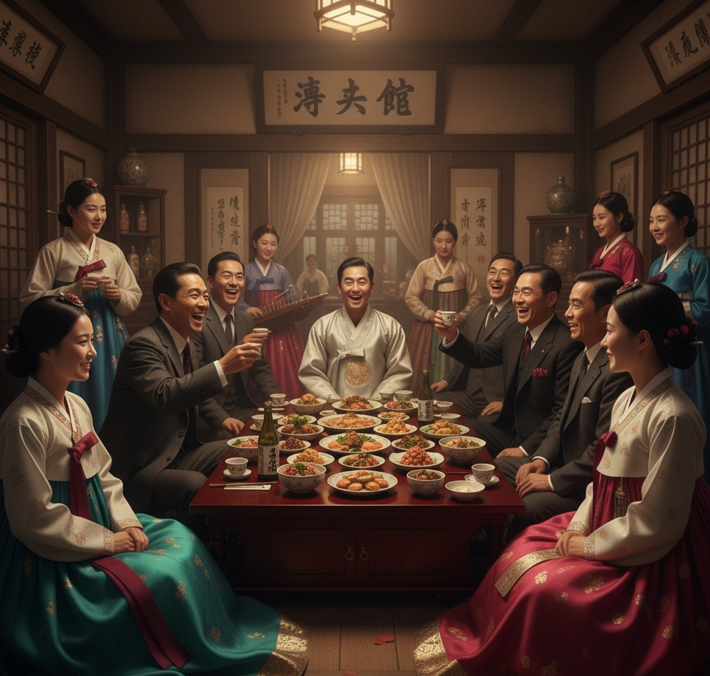 진주관 1층, 같은 시각아래층에서는 일본인 고관들과 친일파들이 기생들과 술을 마시며 즐기고 있었다.일본인 관리 1: "この店は最高だな!(이 가게는 최고야!)"일본인 관리 2: "申さん(신 씨)は本当に商売上手だ!(신 씨는 정말 장사를 잘해!)"친일파: "그렇습니다. 신우혁 씨는 제국에 협조적인 훌륭한 조선인입니다."그들은 몰랐다. 자신들을 접대하는 이 요정의 주인이... 밤이 되면 그들을 제거하는 자객이라는 것을.