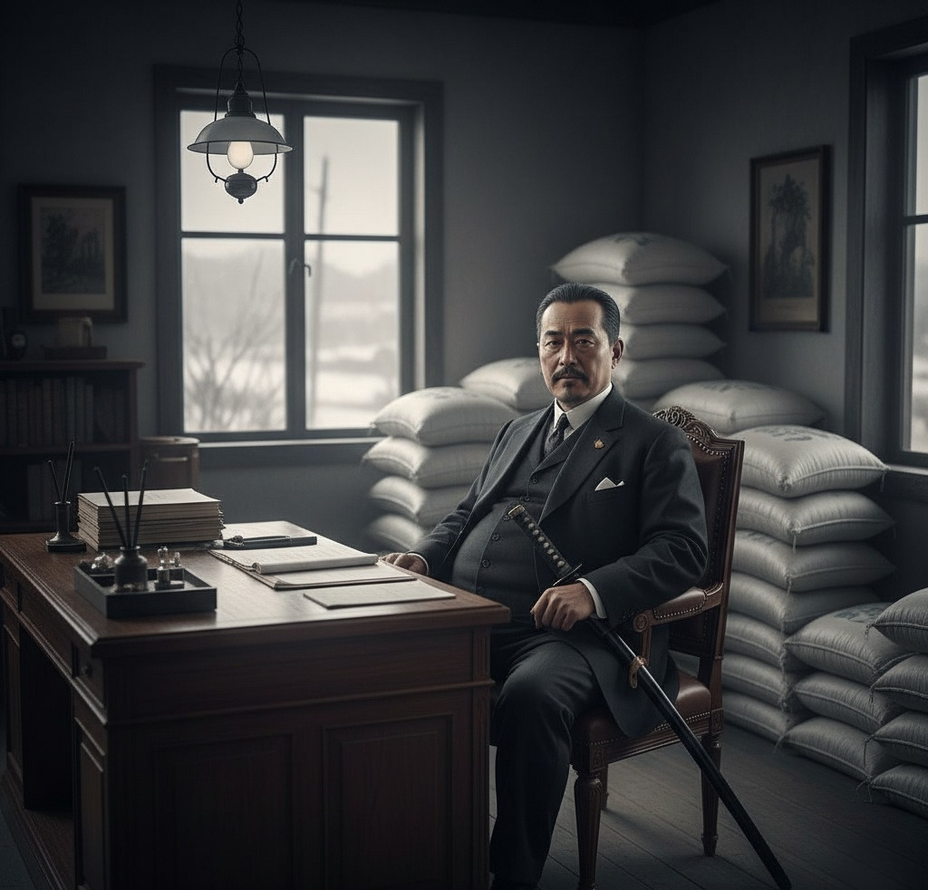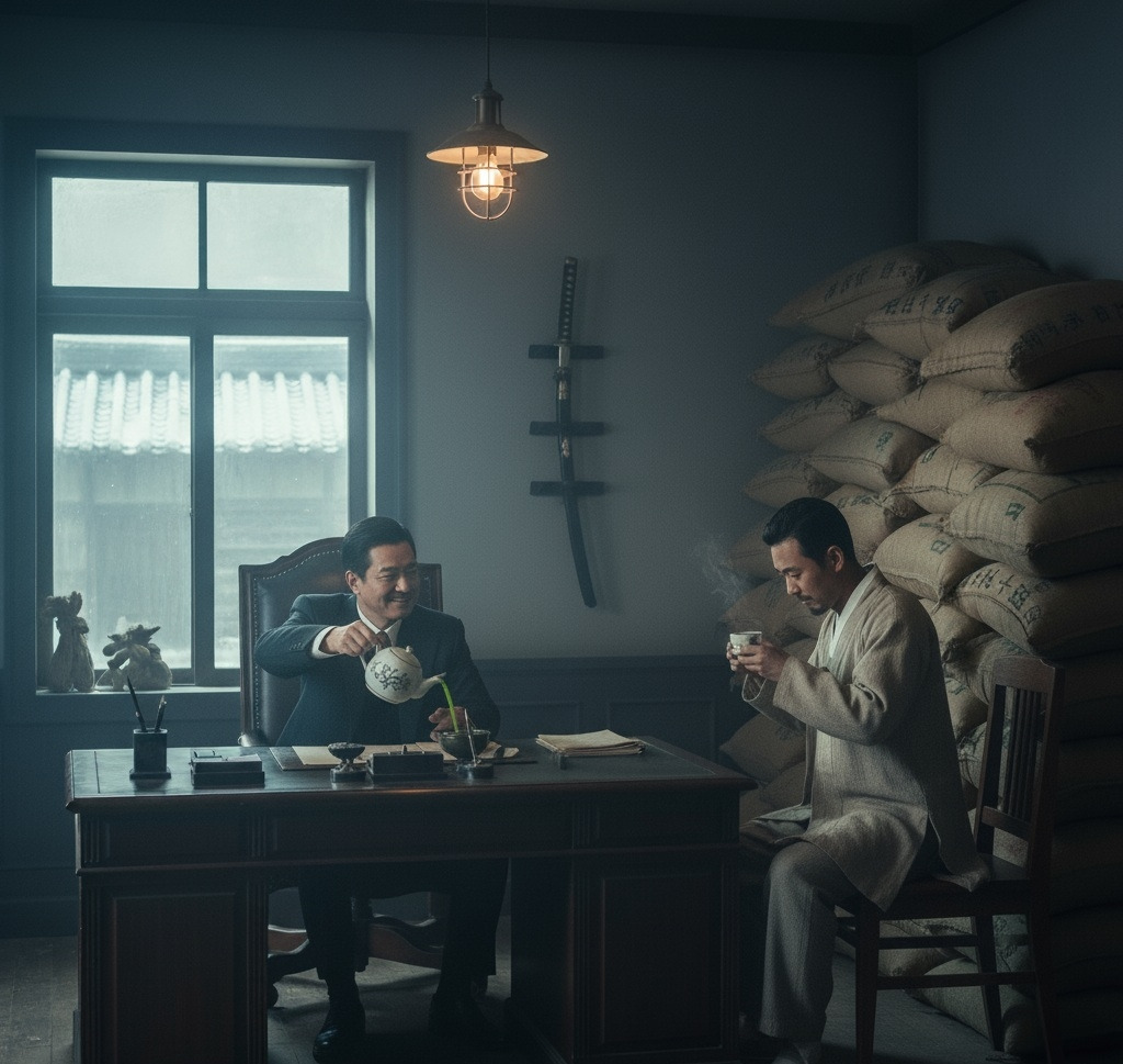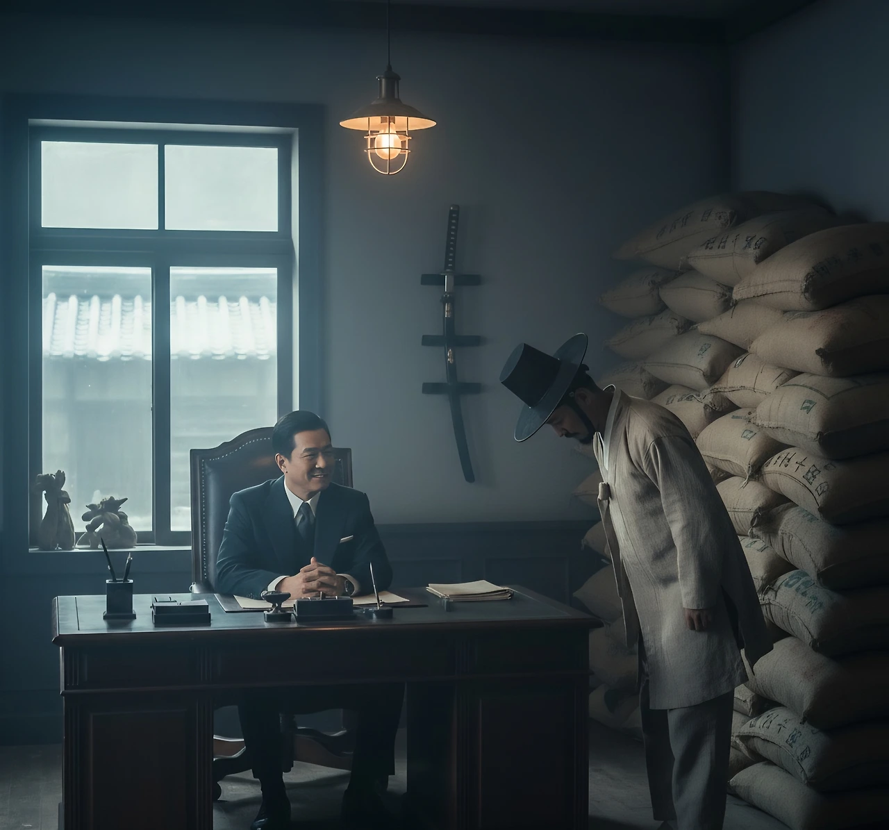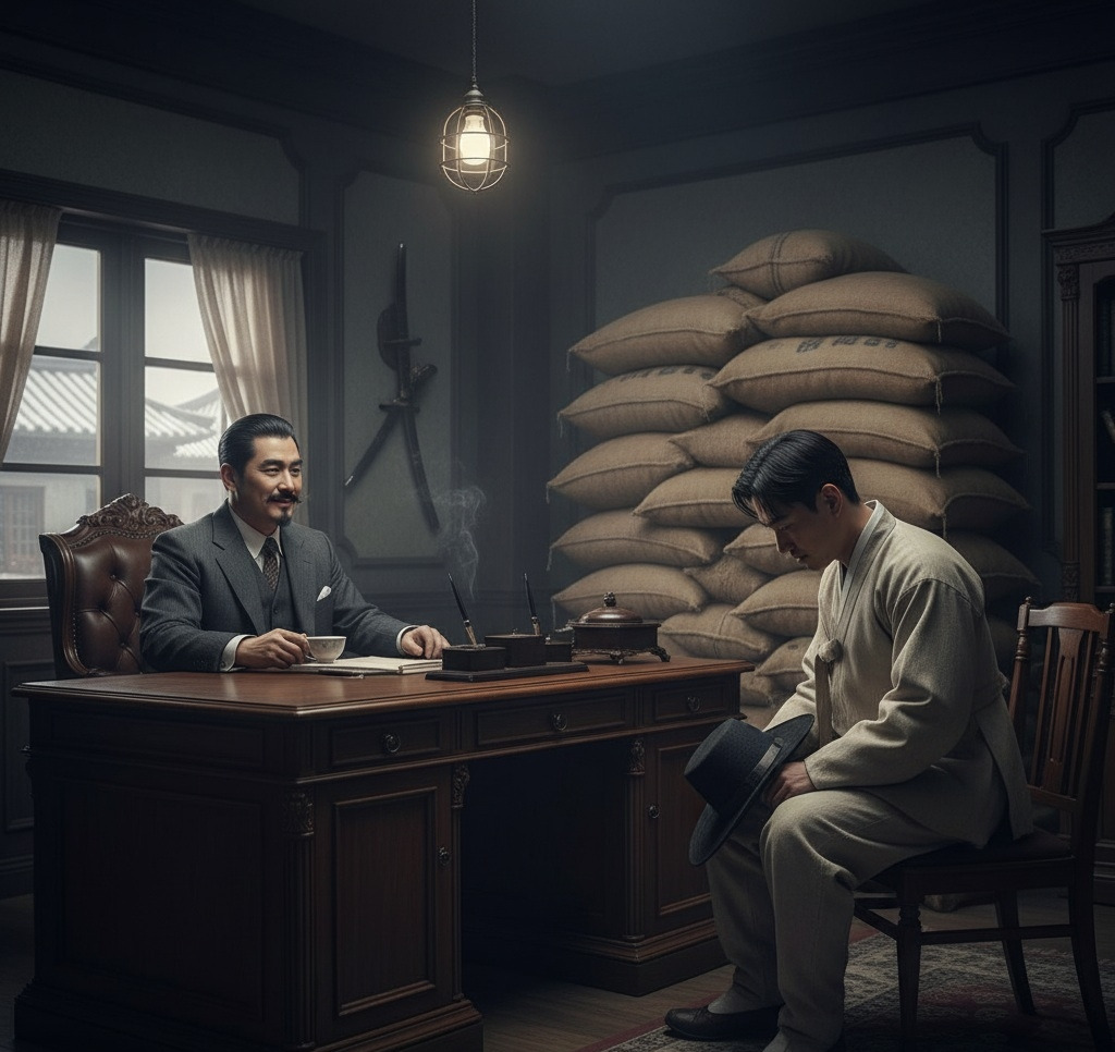 사무실은 매우 호화로웠다. 고급 목재로 만든 책상과 의자, 벽에 걸린 일본도, 그리고 구석에 쌓인 쌀가마니들. 조선 농민들로부터 수탈한 양곡이 넘쳐났다.
