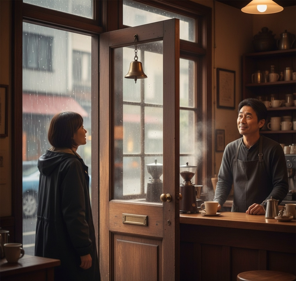 문을 열자, 종소리가 조용히 울렸다. 따뜻한 커피 향과 나무 내음이 코끝을 간질였다. 내가 들어온 걸 눈치챈 듯, 카운터 너머에서 한 남자가 고개를 들었다.