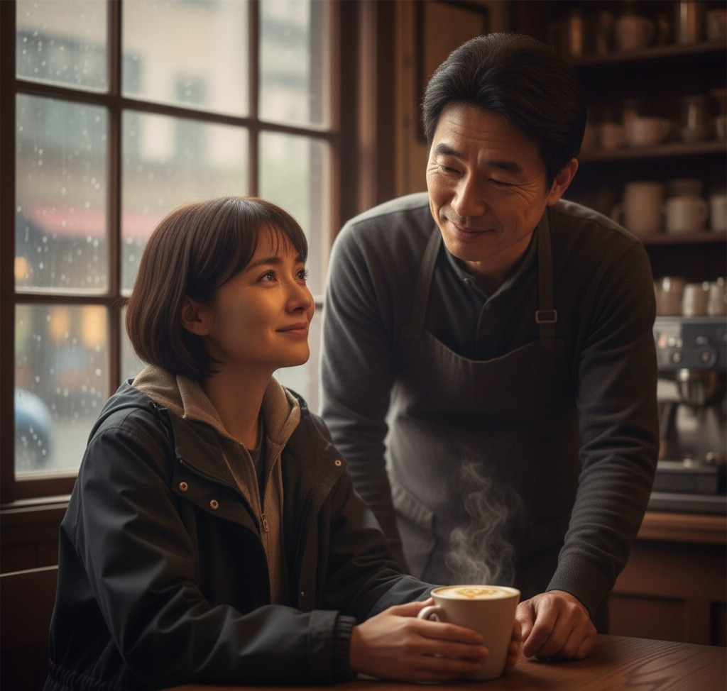 “따뜻한 거 드릴게요. 꿀 라떼 좋아하세요?” 나는 고개만 끄덕였다. 말이 잘 나오지 않았다. 그는 조심스럽게 커피를 내리기 시작했다. 그의 손놀림은 부드럽고 정성스러웠다. 마치 커피 한 잔에 위로를 담으려는 듯했다.
