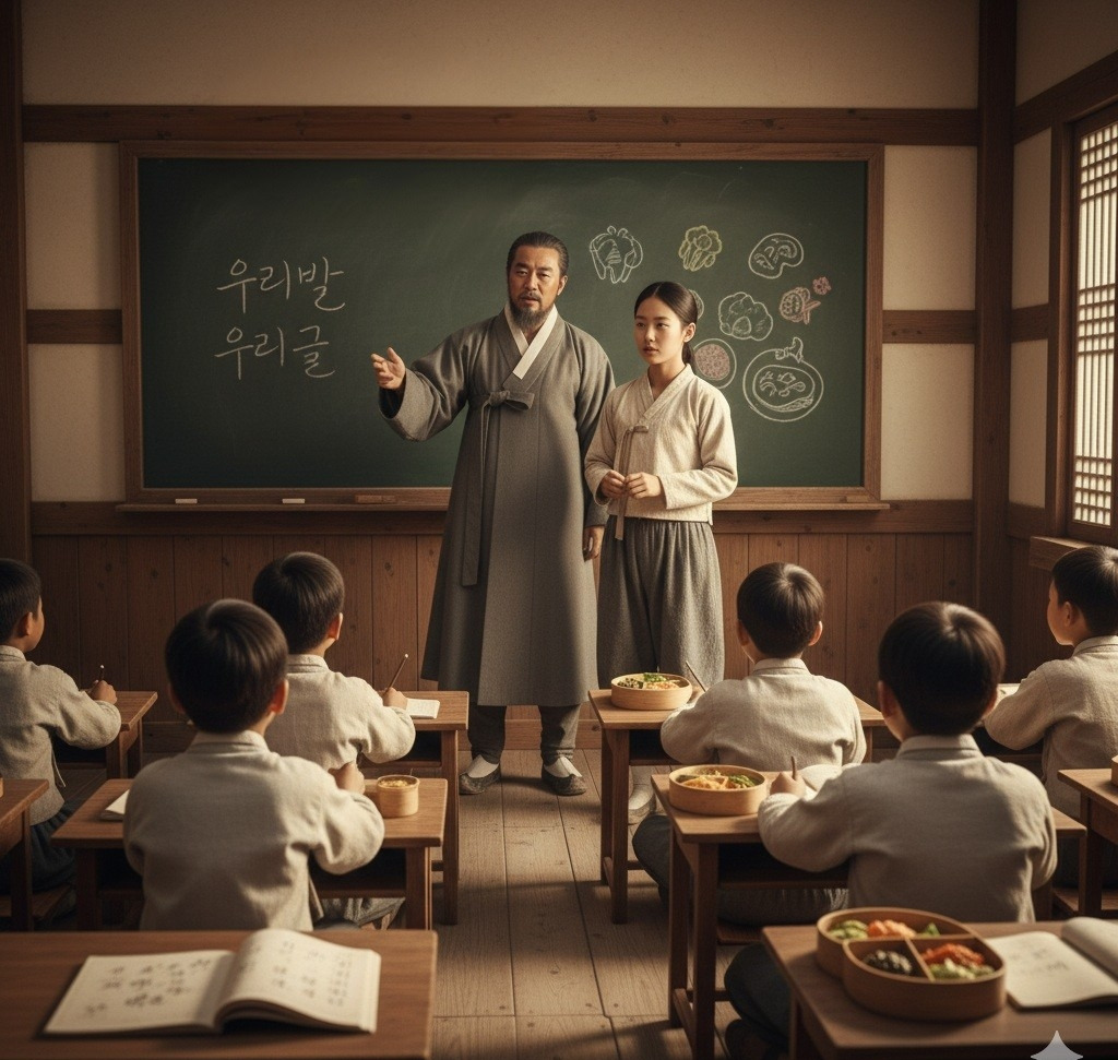 아이들은 도시락을 열어 각자 싸온 음식을 꺼냈다. 밥, 나물, 김치, 그리고 간혹 조기 한 마리가 전부였다. 강지윤은 칠판에 밥, 채소, 고기, 물을 각각 그려 넣었다.
