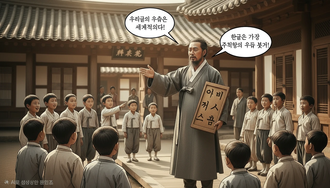 이산갑의 말에 아이들의 눈이 더욱 초롱초롱해졌다. 교실 안에는 펜이 사각거리는 소리와 조심스럽게 책장을 넘기는 소리만 가득했다. 이산갑은 칠판에 한글을 썼다 지우기를 반복하며 한 글자 한 글자의 의미를 아이들에게 새겨주었다. 밖에서 혹 누군가 들을까, 목소리도 평소보다 낮추었다.