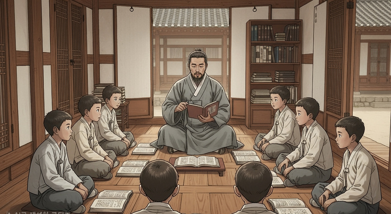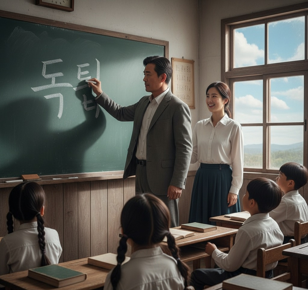 창백한 얼굴을 한 중년의 교사 이산갑이 오래된 목조 교실에서 학생들을 둘러보고 있다. 그의 눈은 결의에 차 있지만 슬픔이 드리워져 있다. 교실은 낡고 소박하며, 칠판에는 희미한 한글 글씨가 보인다. 학생들은 진지한 표정으로 선생님의 말을 경청하고 있으며, 그들의 눈에는 불안감과 함께 희미한 희망이 엿보인다. 햇빛이 창문을 통해 들어와 먼지 낀 공기를 비추고, 교실 한쪽에는 강지윤이라는 이름의 젊은 여교사가 학생들을 따뜻하고 격려하는 눈빛으로 바라보고 있다. 낡은 교과서와 필기 도구가 테이블 위에 놓여 있다.