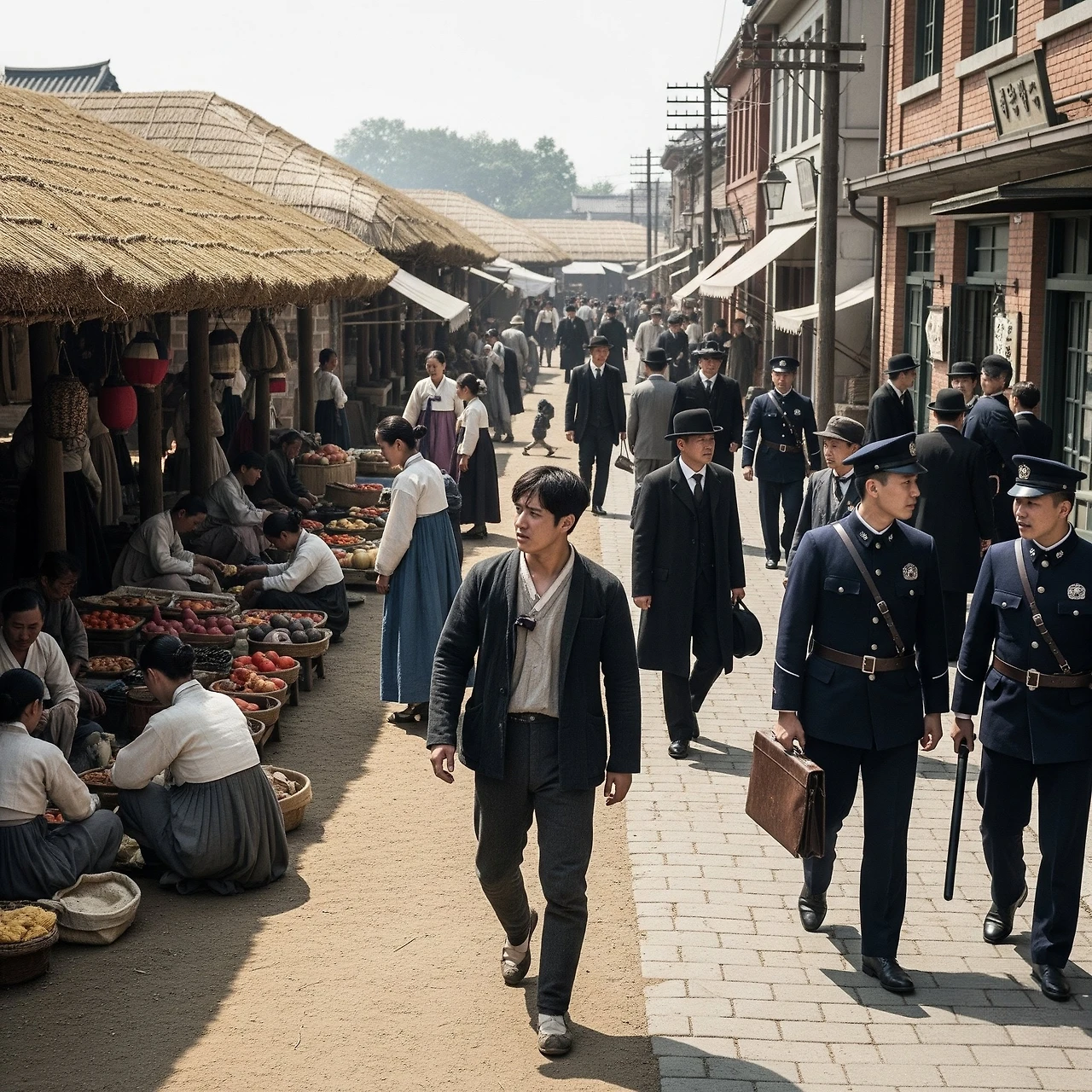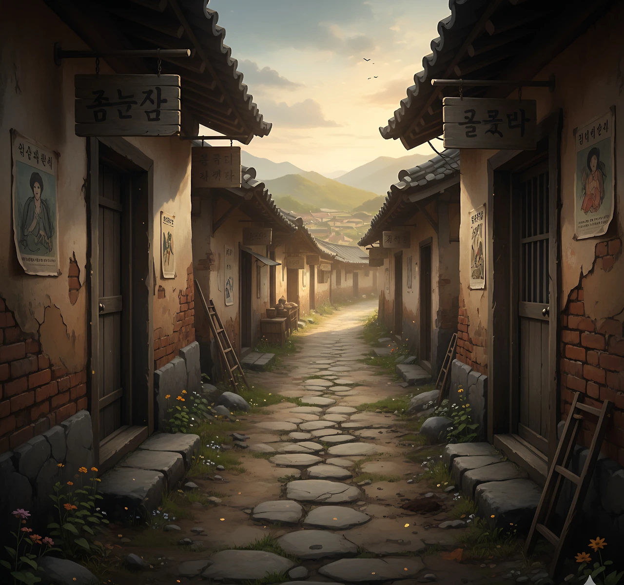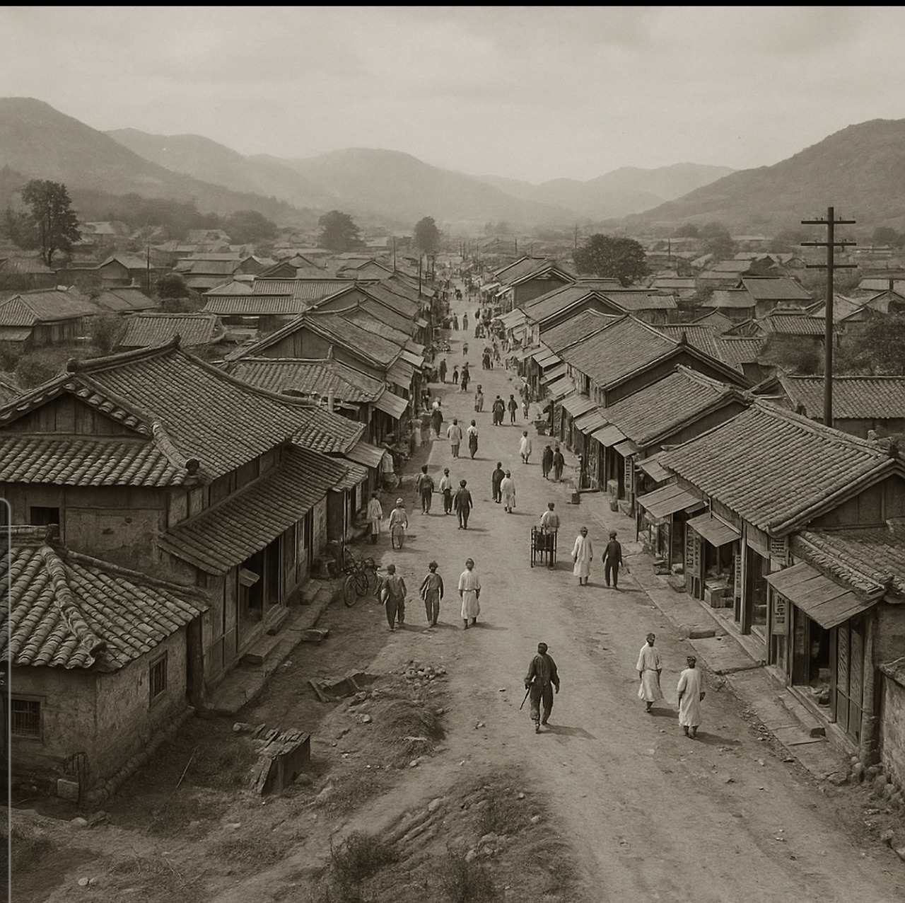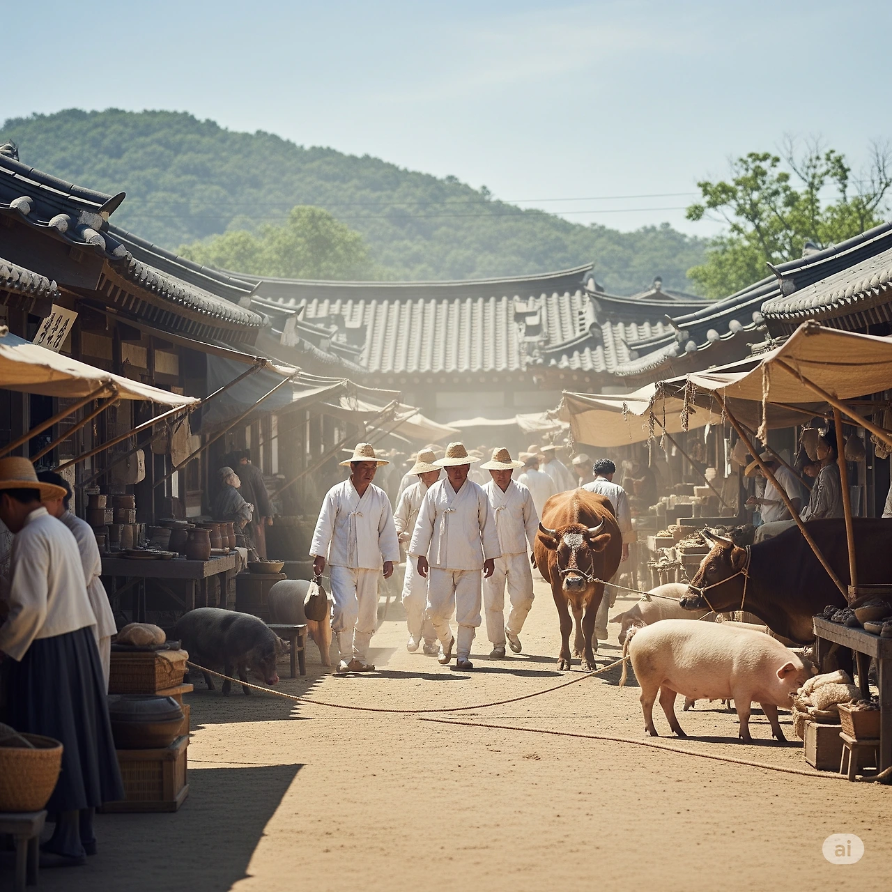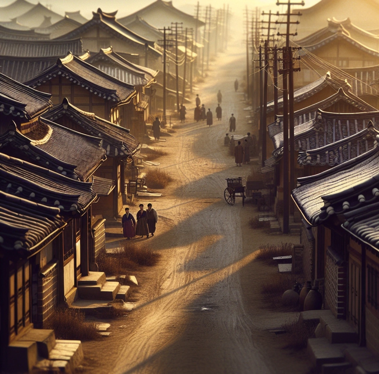 거리는 아직 사람들로 붐비지 않았지만, 그 고요함 속에서도 생명의 움직임이 느껴졌다. 기와집마다 밥 짓는 냄새가 퍼져나가며, 아침 식사 준비로 분주한 가정의 따스함을 전했다.
