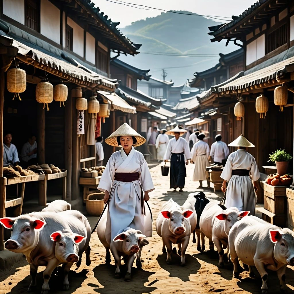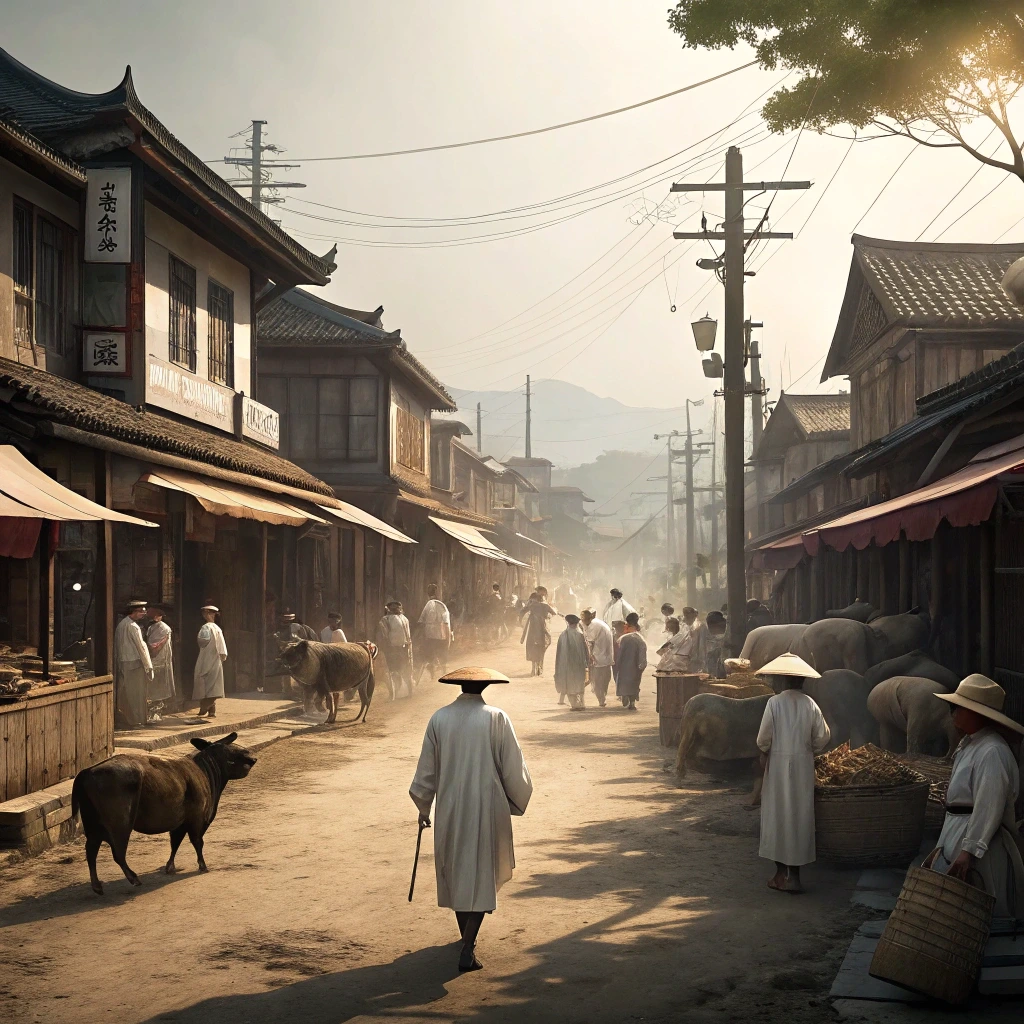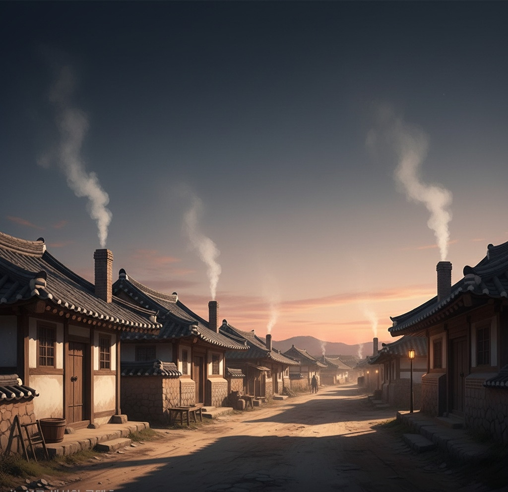 이른 아침, 아직 세상이 완전히 깨어나기 전, 읍내 상가 주변의 기와집들에서는 밥 짓는 연기가 가늘게 피어오르고 있었다. 이 연기는 마치 동이 트기 전의 어둠 속에서 희미한 희망의 불빛처럼, 각 집의 굴뚝에서 조용히 하늘로 올라가며 아침의 시작을 알렸다.