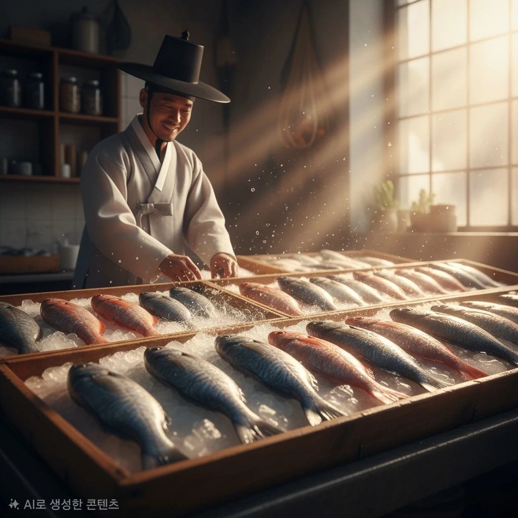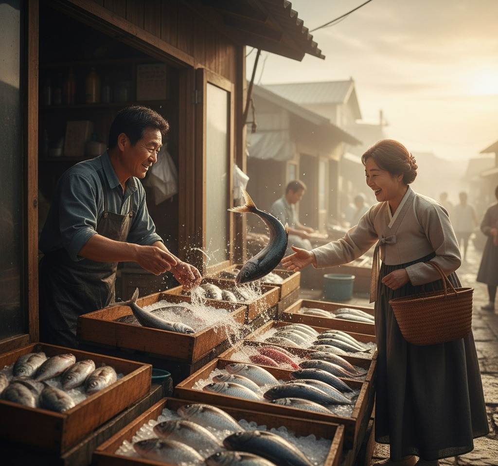 이른 아침, 아직 세상이 완전히 깨어나기 전, 작은 마을의 수산물 상점에서는 이미 활기찬 움직임이 시작되고 있었다. 문을 열고 들어서는 순간, 신선한 바다 내음이 코를 찔렀다. 상점 안에는 각종 생선들이 얼음 위에 가지런히 놓여 있었고, 그 사이사이로 싱싱한 생선들이 마치 손님을 반기듯 퍼덕거리고 있었다.