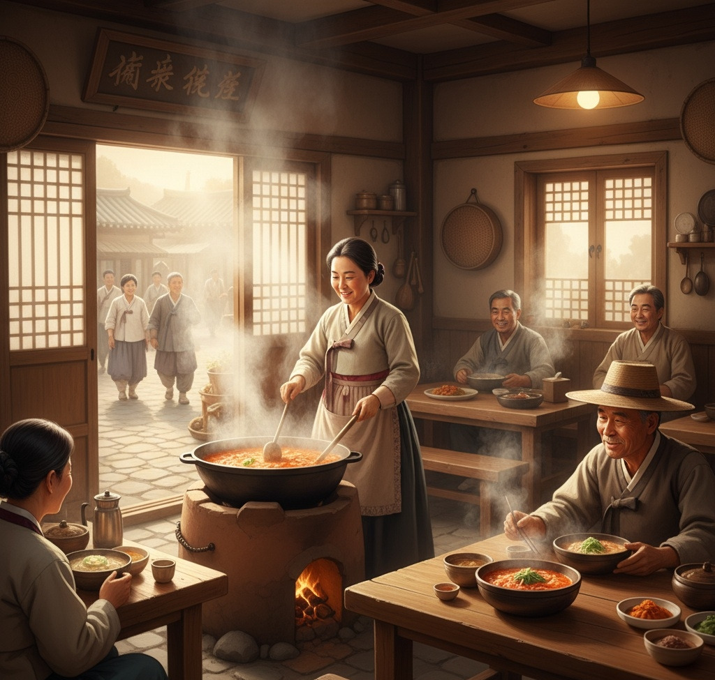 식당 안에서는 아침 일찍부터 주인아주머니가 분주히 움직이며 손님들을 맞이할 준비를 하고 있었다. 그 향기로운 김은 마치 식당의 따뜻한 마음을 전하는 듯, 이른 아침의 서늘함을 녹여내고 있었다.
