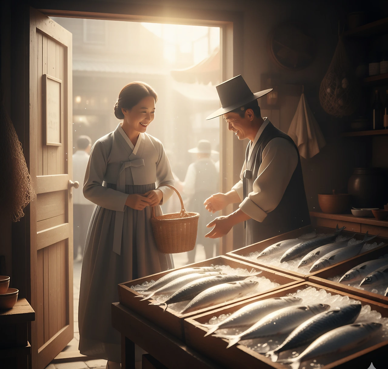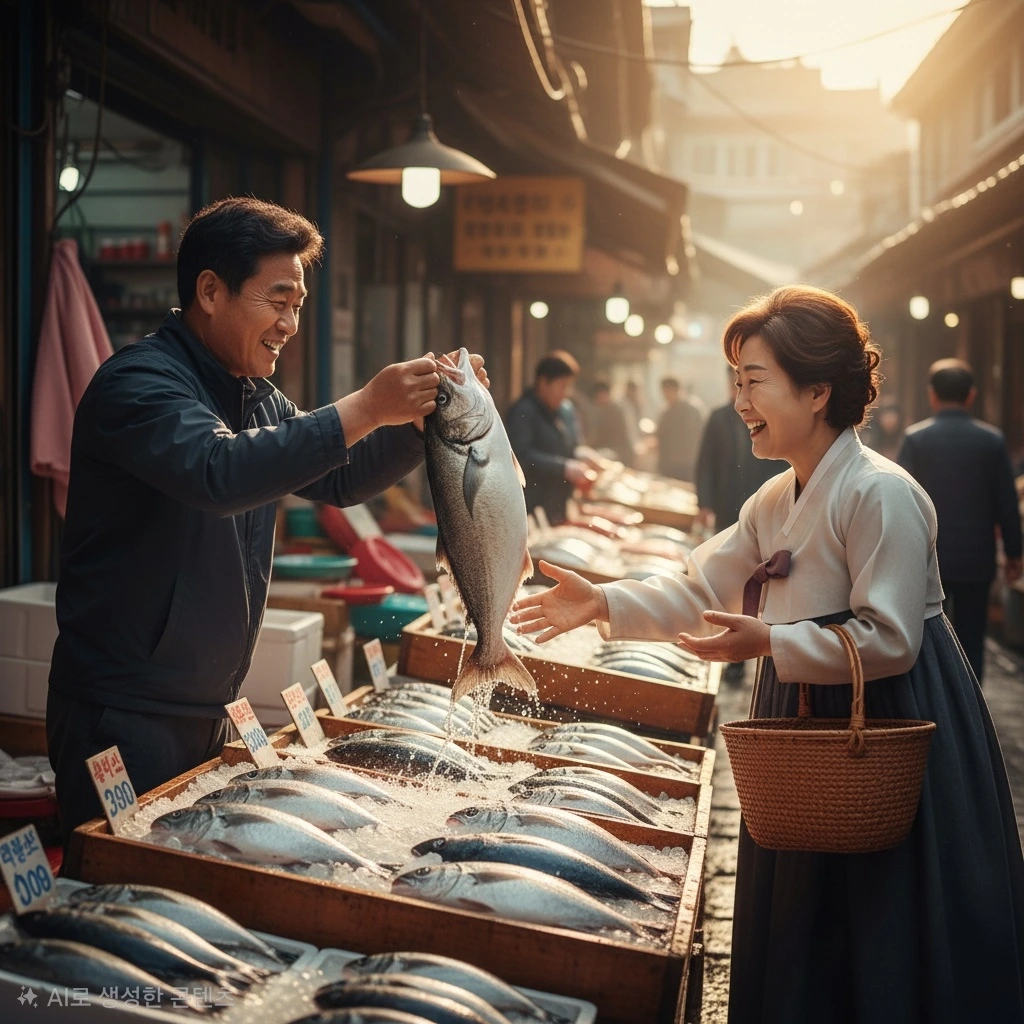 첫 손님이 문을 열고 들어서자, 상점 안은 더욱 활기로 가득 찼다. 이 손님은 생선을 고르기 위해 조심스럽게 손을 뻗었고, 퍼덕거리는 생선을 보며 미소를 지었다. "이렇게 싱싱한 생선은 아침 식사로 딱이지." 그는 중얼거리며 가장 튼실해 보이는 생선을 선택했다.