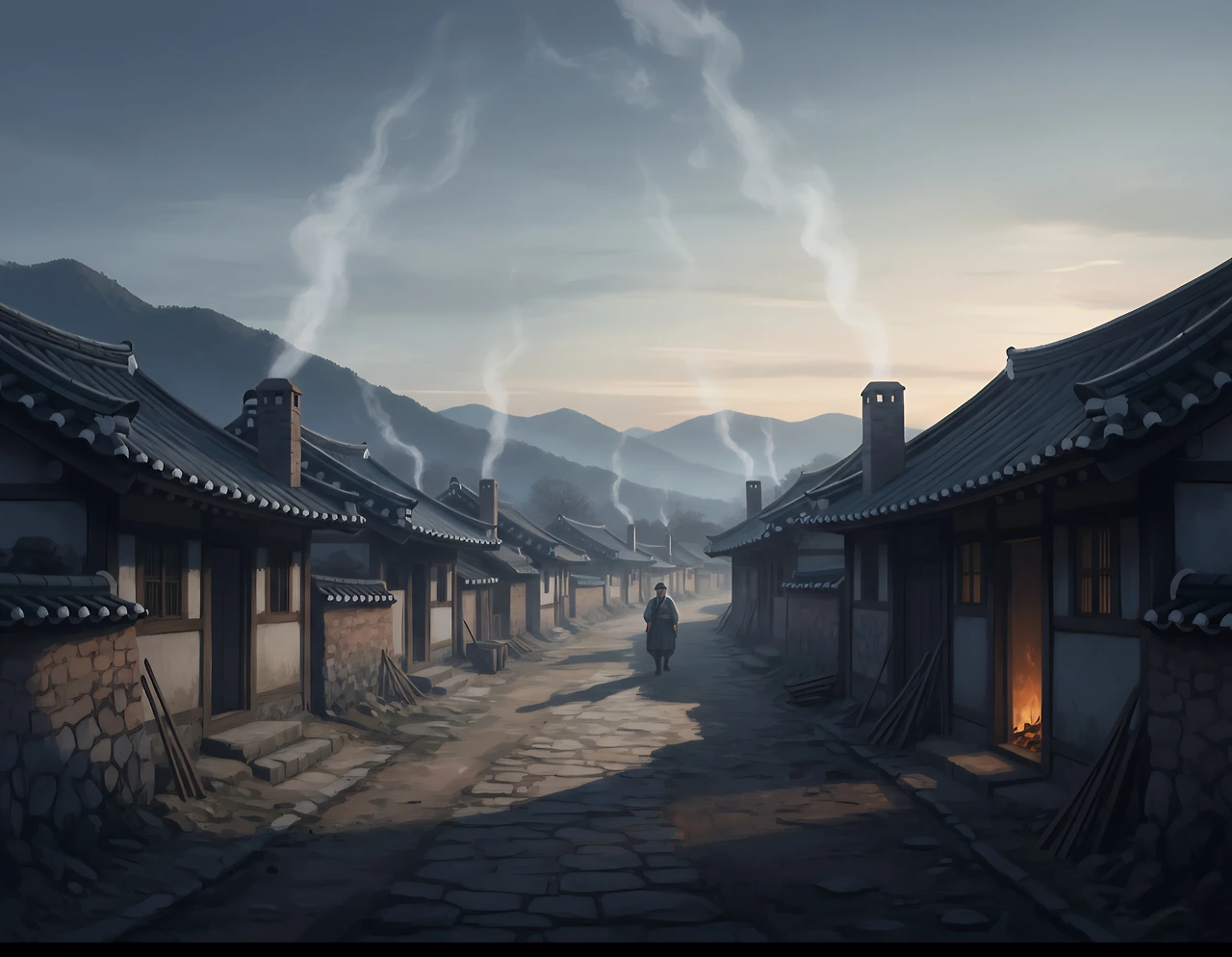골목은 여전히 고요했지만, 장작 타는 냄새는 그 침묵 속에서도 생동감을 불어넣었다. 이 냄새는 집안의 난로나 부뚜막에서 시작되어, 창틈과 문틈으로 새어 나와 골목을 따라 퍼졌다.