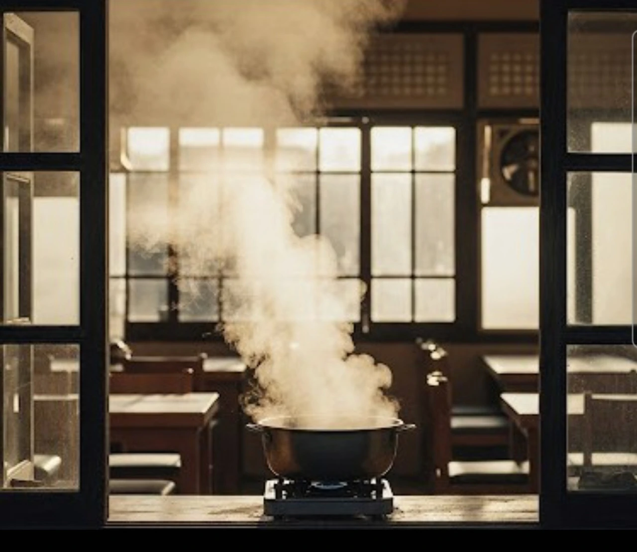 근처 영훈 식당의 창문으로는 따뜻한 국물이 끓고 있는 냄비에서 모락모락 피어오르는 김이 보였다. 그 김이 창문을 뿌옇게 만들며, 지나가는 사람들에게 식욕을 자극했다.
