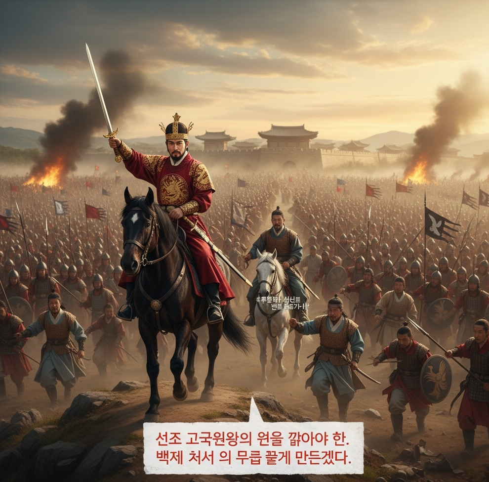 "선조 고국원왕의 원수를 갚아야 한다. 백제를 쳐서 우리 무릎 꿇게 만들겠다."