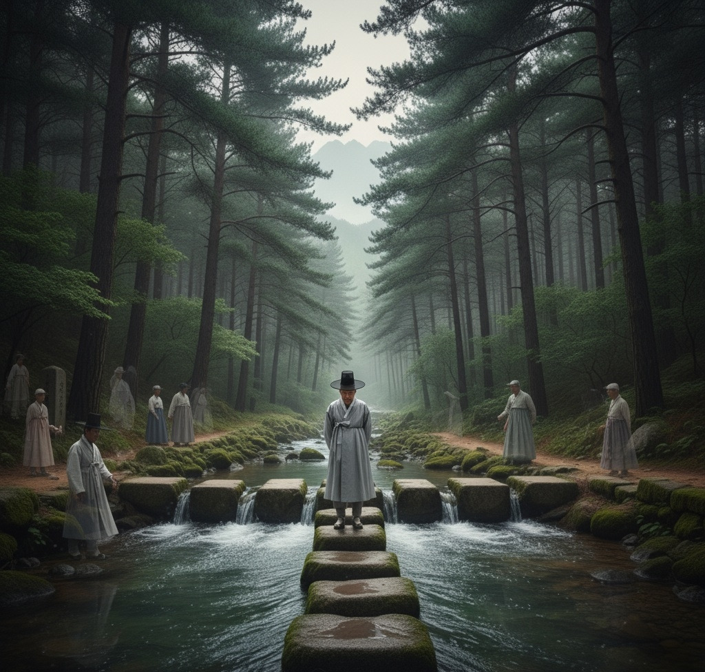 길섶 섬돌에 적힌 이정표를 뒤로하고 한참을 또다시 걸어가다 보면, 산 어귀의 시냇물 위를 돌로 채워놓은 징검다리를 만나게 된다. 징검다리는 마치 자연과의 교감을 위한 다리처럼, 사람들을 물뫼산의 깊은 곳으로 이끈다. 돌 위를 건너며 발걸음마다 물소리가 들리고, 주변의 모든 것이 한 폭의 그림처럼 아름답게 다가온다. 이곳에서의 여정은 단순한 산책을 넘어, 자연과의 깊은 소통이며, 사람들의 삶이 자연 속에 어떻게 녹아들었는지를 체험하는 시간이 된다.