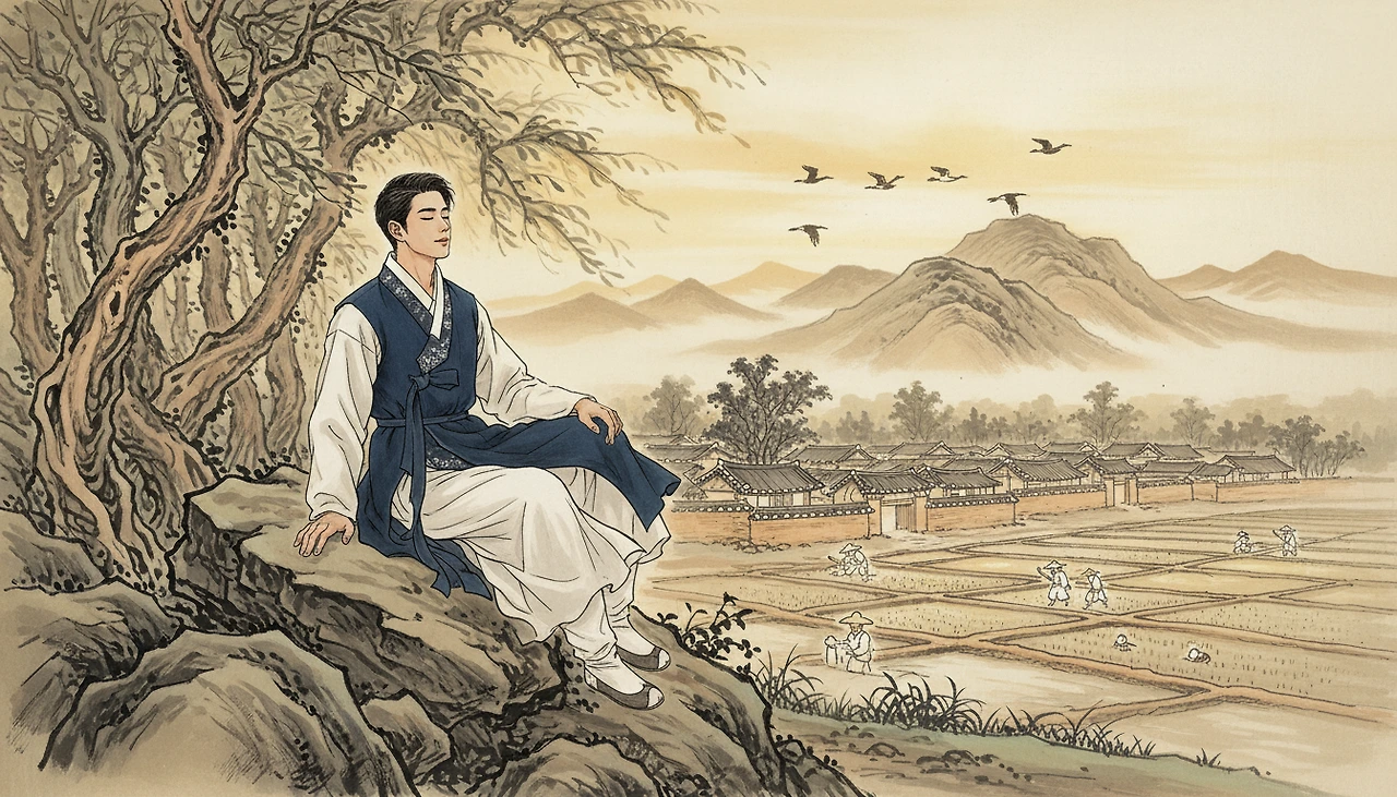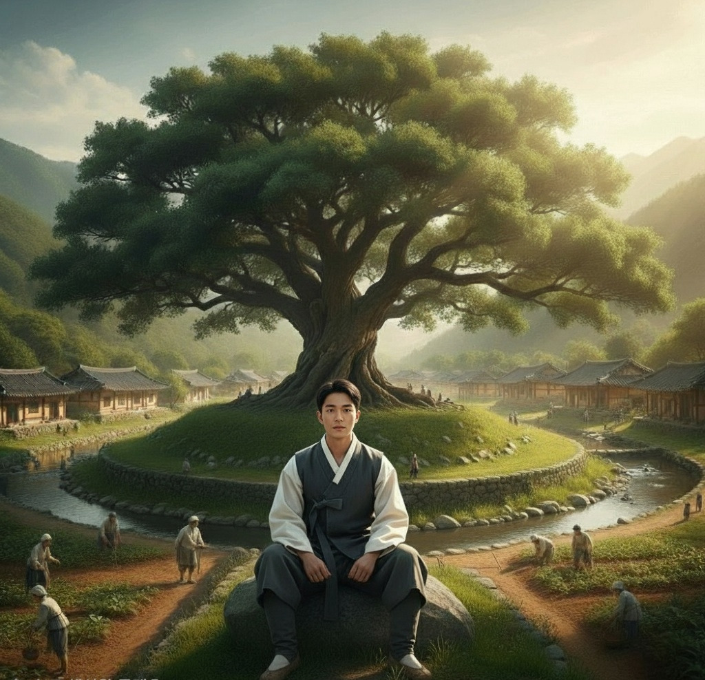 이산갑의 회상은 그렇게 팽나무 아래, 넓은 바위통에 앉아 자연과 함께 이어졌다. 당산 언덕 위의 넓은 바위통에 몸을 기대고 앉은 이산갑은, 오늘도 윗마을 자신의 경작지를 내려다보며 깊은 생각에 잠긴다. 이 높은 곳에서 바라보는 경작지는 마치 그의 인생처럼 넓고 깊게 펼쳐져 있었다.