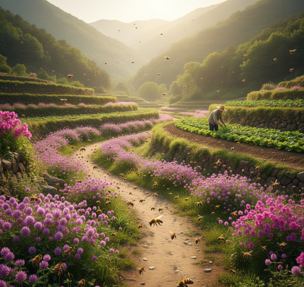 산속으로 더 깊이 들어가면, 바람에 실린 산나물의 내음이 코를 간지럽히고, 진달래 빛 자운영 꽃들이 윙윙거리는 벌떼를 유혹하는 밭두렁을 지나게 된다. 이곳에서는 자연의 생명력이 그대로 느껴지며, 인간의 손길이 닿은 밭과 자연이 어우러진 풍경이 아름다운 하모니를 이룬다.