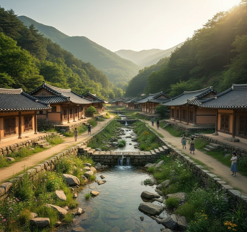 이곳에 자리 잡은 집들은 작은 시냇물이 흐르는 골짜기 사이에 흩어져 있어, 마치 자연과 사람이 조화를 이루며 살아가는 모습을 보여준다. 이 평화로운 풍경은 마치 사람들의 일상이 자연 속에 녹아든 듯한 느낌을 준다.