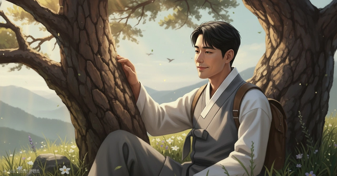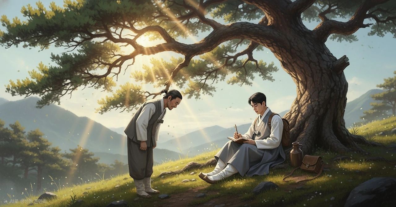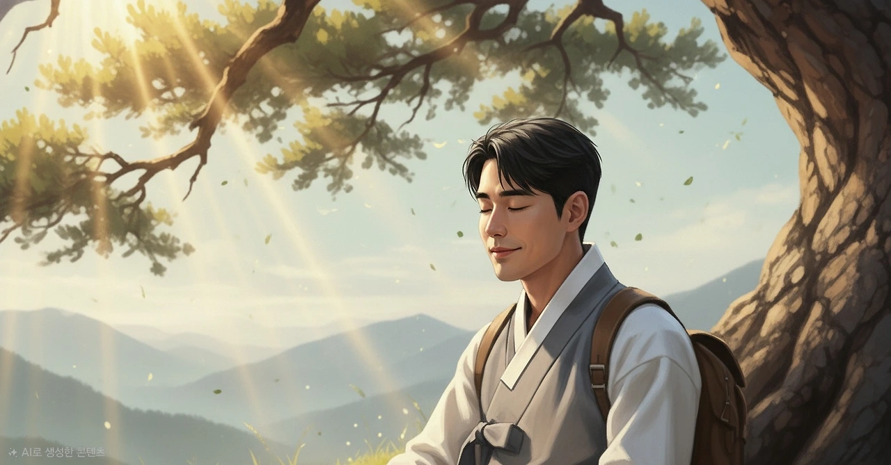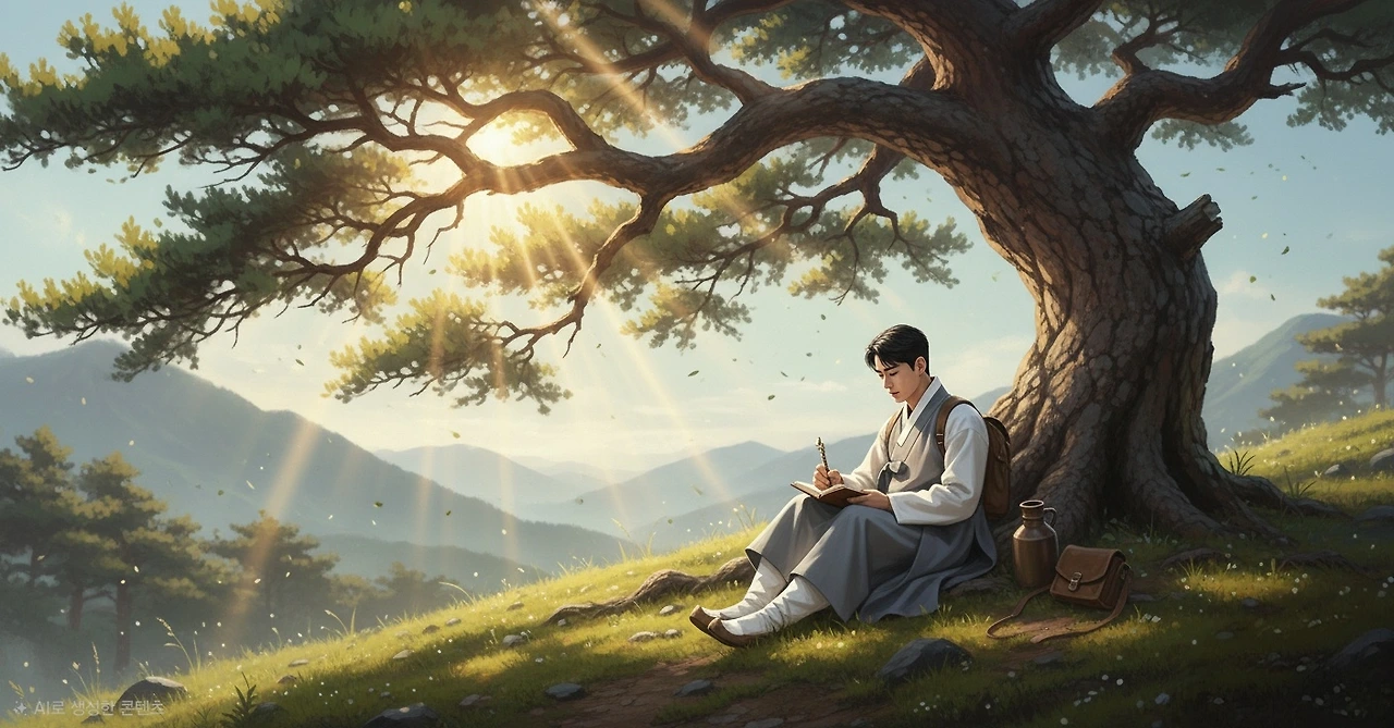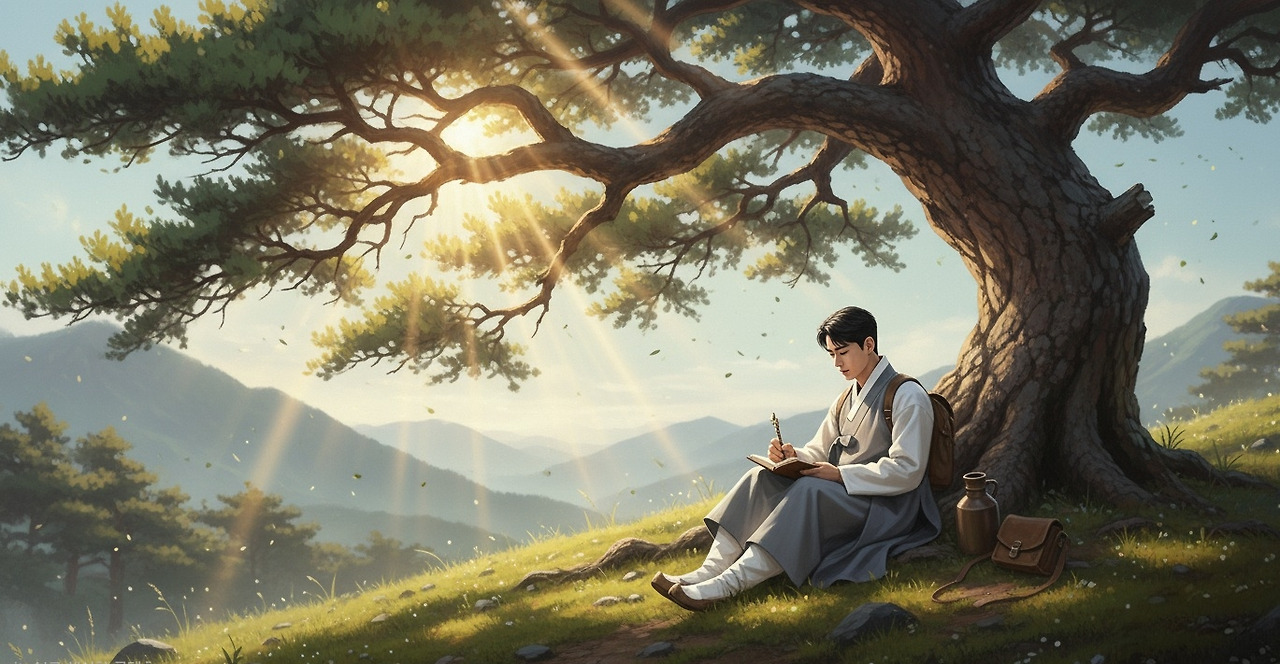 소나무 아래에 앉은 그는 눈앞에 펼쳐진 고요한 풍경을 바라보며, 일상에서는 결코 맛볼 수 없었던 운치와 평화를 천천히 음미했다.