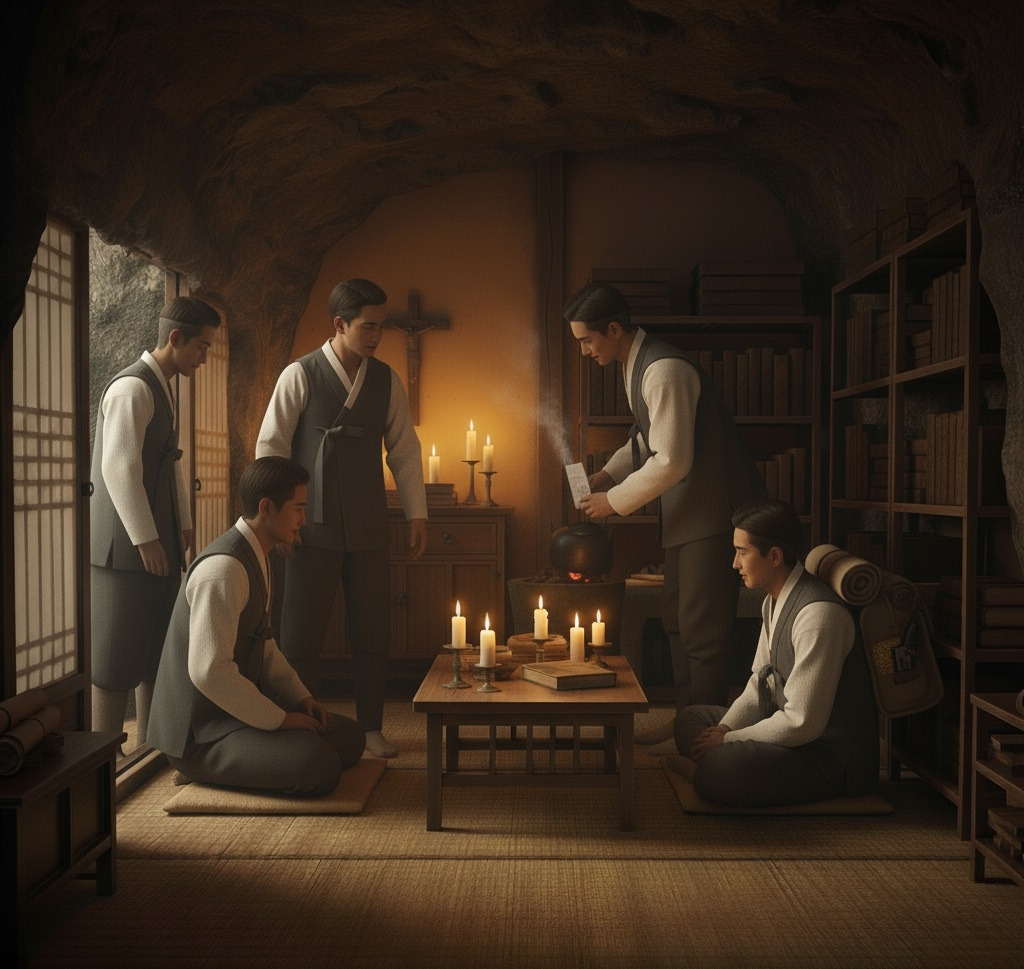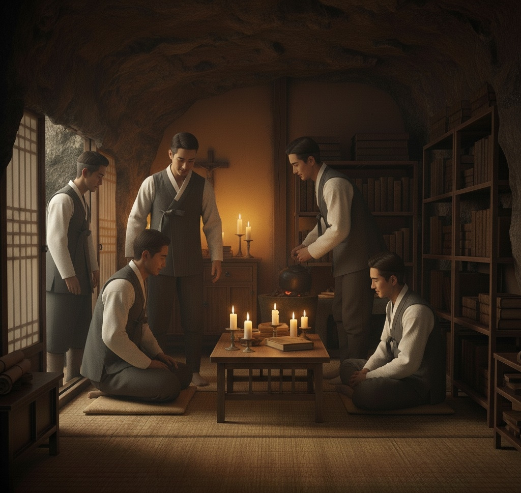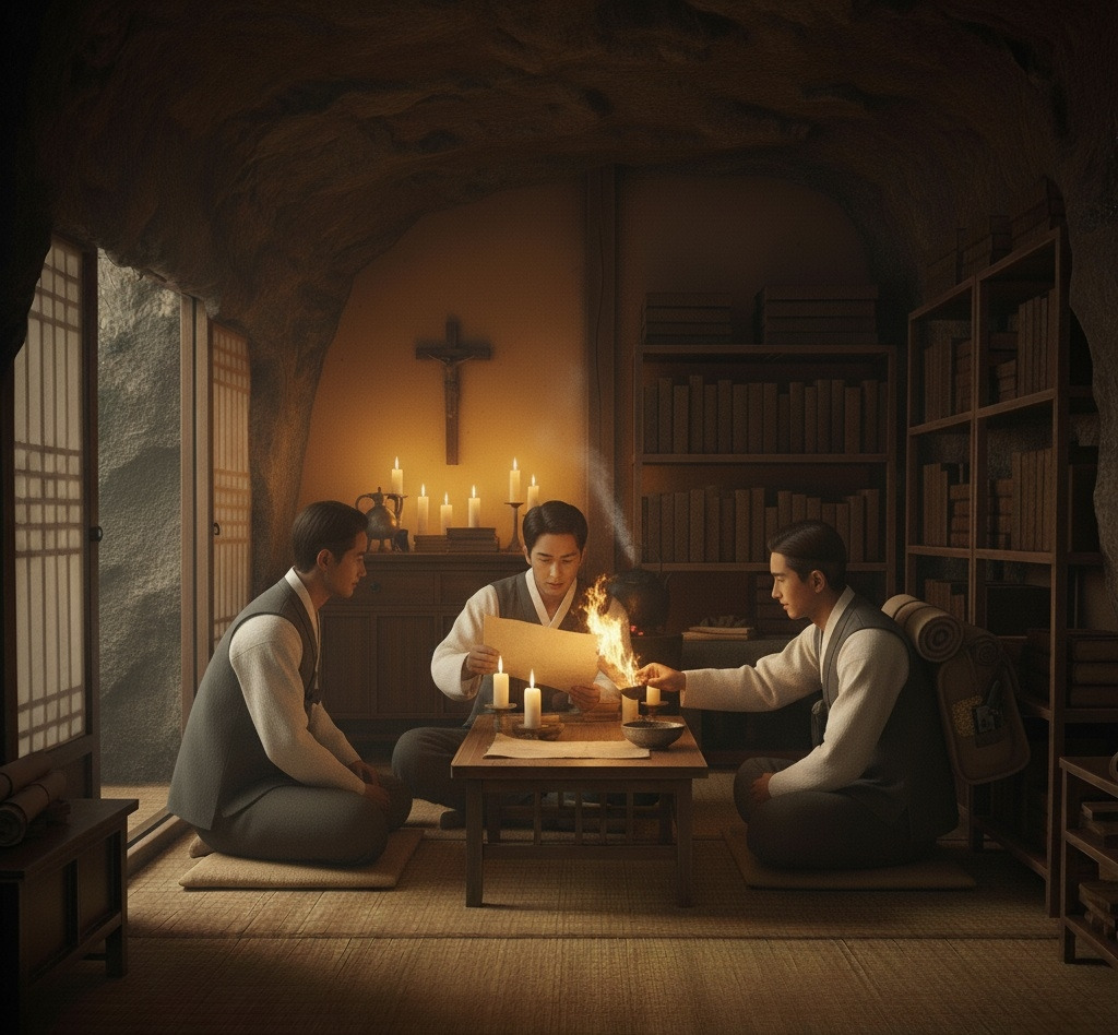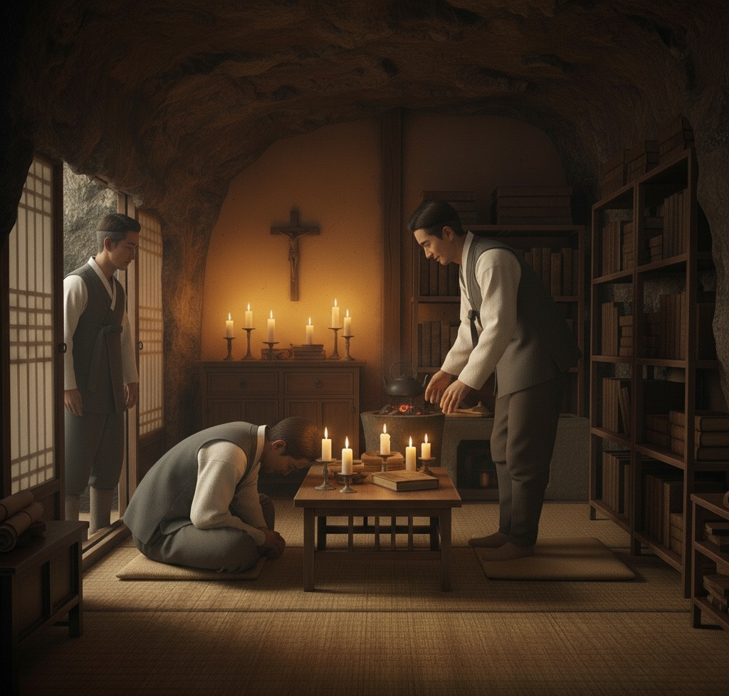 그 안은 작은 방 크기의 옛날 신부님의 제의실 인듯했다. 책장과 작은 상이 보였고 촛불이 환하게 켜져 있었다.