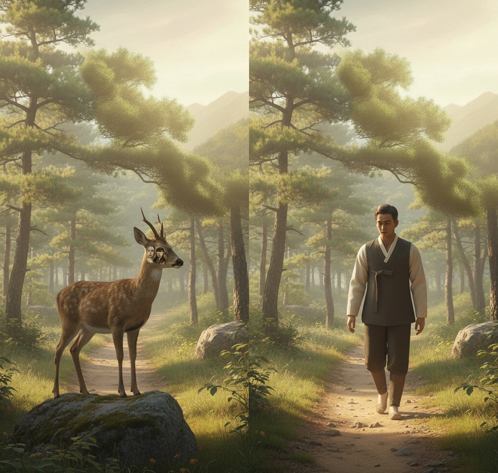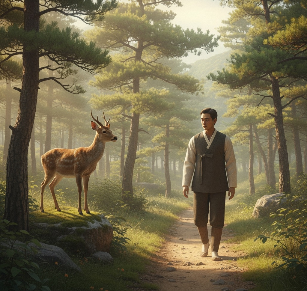 "오전 햇살이 나뭇잎 위에 부드럽게 깃들며, 산새들이 나직이 노래를 불렀다. 바람은 이산갑의 걸음에 따라 리듬을 맞추는 듯했다."걸어 내려가던 숲 바위 위로 한 마리의 노루가 조용히 모습을 드러냈다. 이산갑은 한동안 발길을 멈추며 노루의 맑은 눈빛을 응시했다.