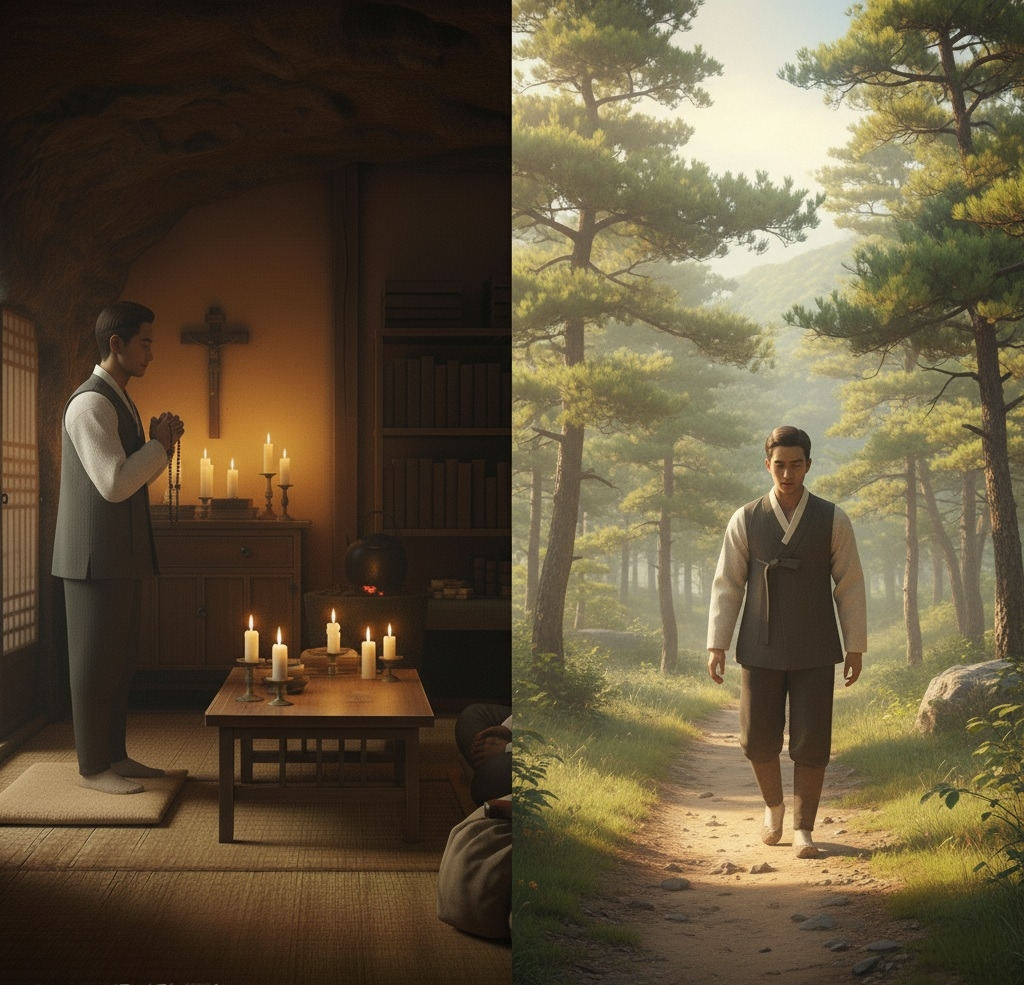 이 들이 먼저 동굴을 빠져나간 뒤에도 이산갑은 손에 묵주를 쥐고 동고상 앞에 서서 그 들의 무사한 여정을 위해 기도를 하였다. 동굴을 빠져나온 이산갑은 여유로움 속에 평온을 찾은 모습으로 하산을 하기 시작했다.