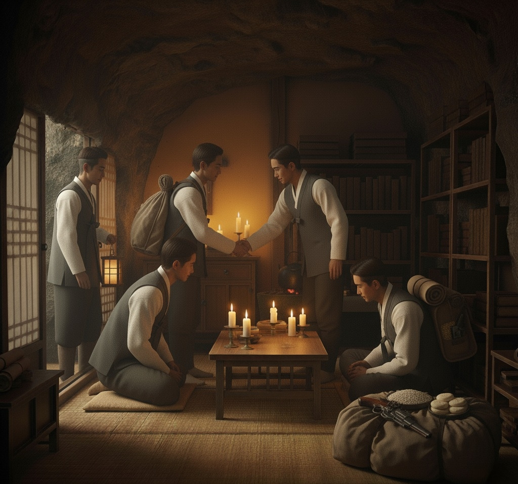 " 동지, 항상 건강하시고 평안하시길 기도 하겠습니다."한재호가 이산갑의 손을 굳게 잡으며 말을 했다. 김유성은 권총과 단도등을 가방 깊숙이 챙겨 넣고 그 위에 쌀보리와 약간의 개떡을 얹혀 넣고 봇짐을 메며 이산갑을 향해 깊은 인사를 하였다.