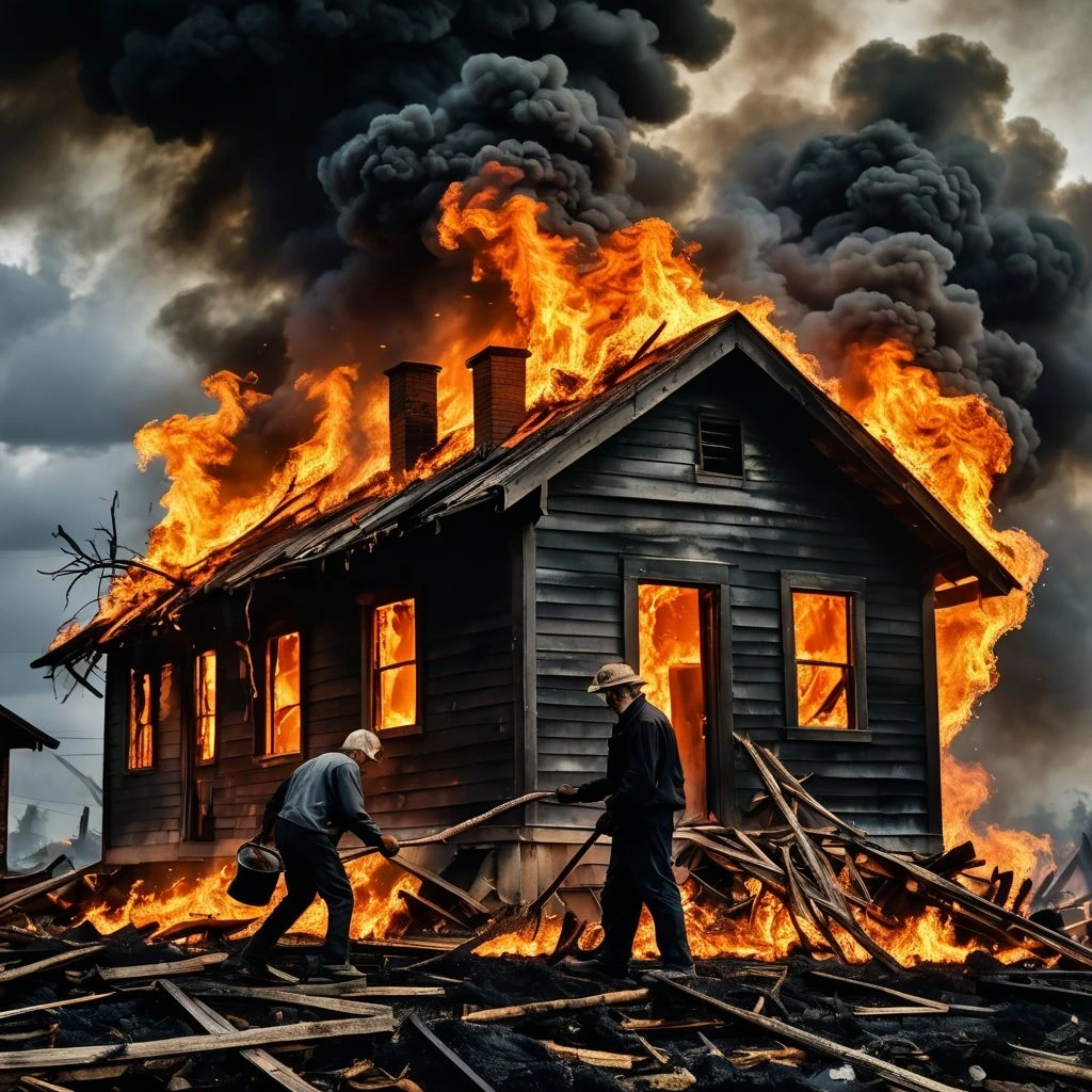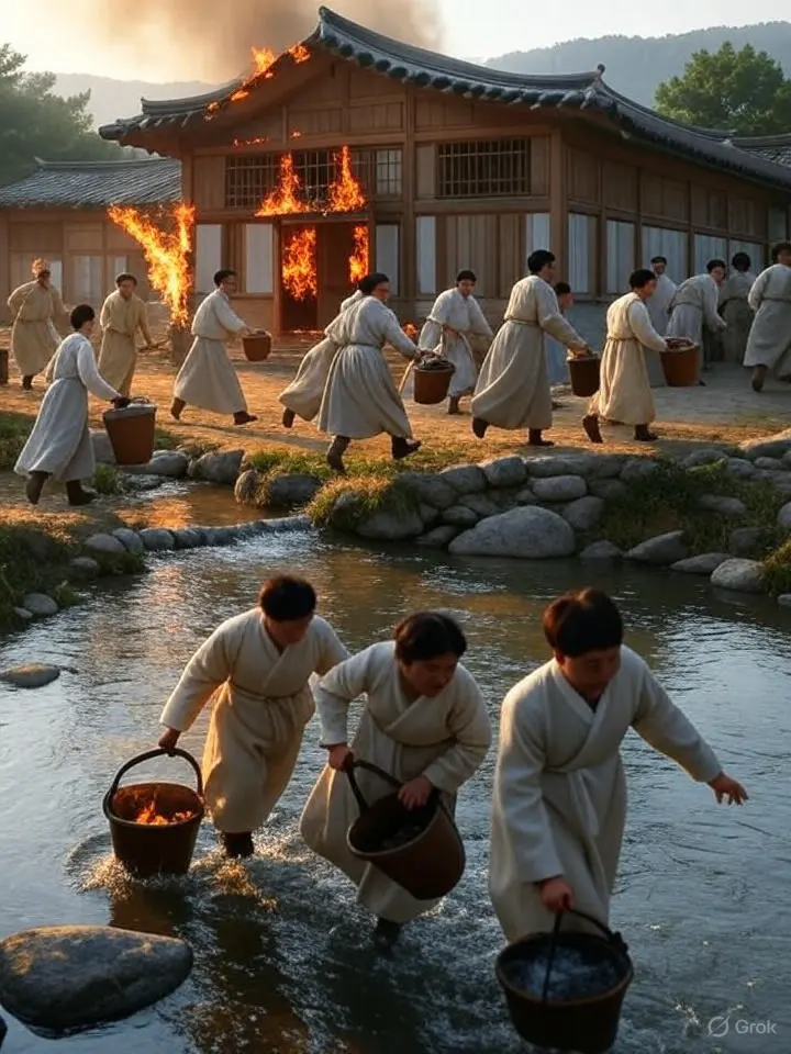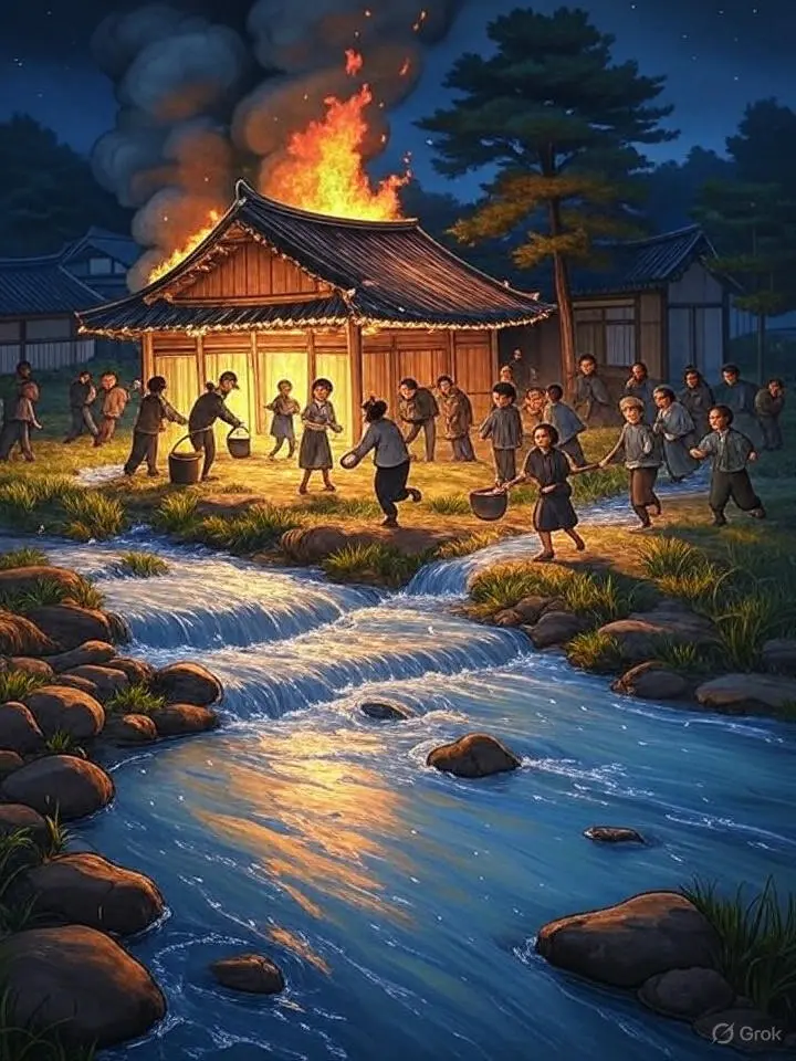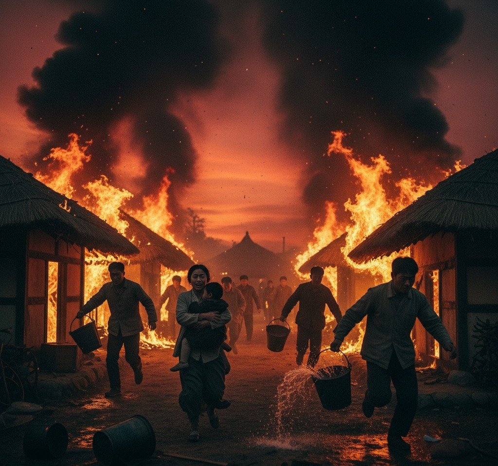 마을 사람들이 필사적으로 우물을 오가며 물을 퍼 날랐지만, 불길은 잡힐 줄 몰랐다마을 사람들이 필사적으로 개울과 우물을 오가며 물을 퍼 날랐지만, 불길은 잡힐 줄 몰랐다