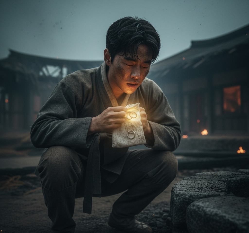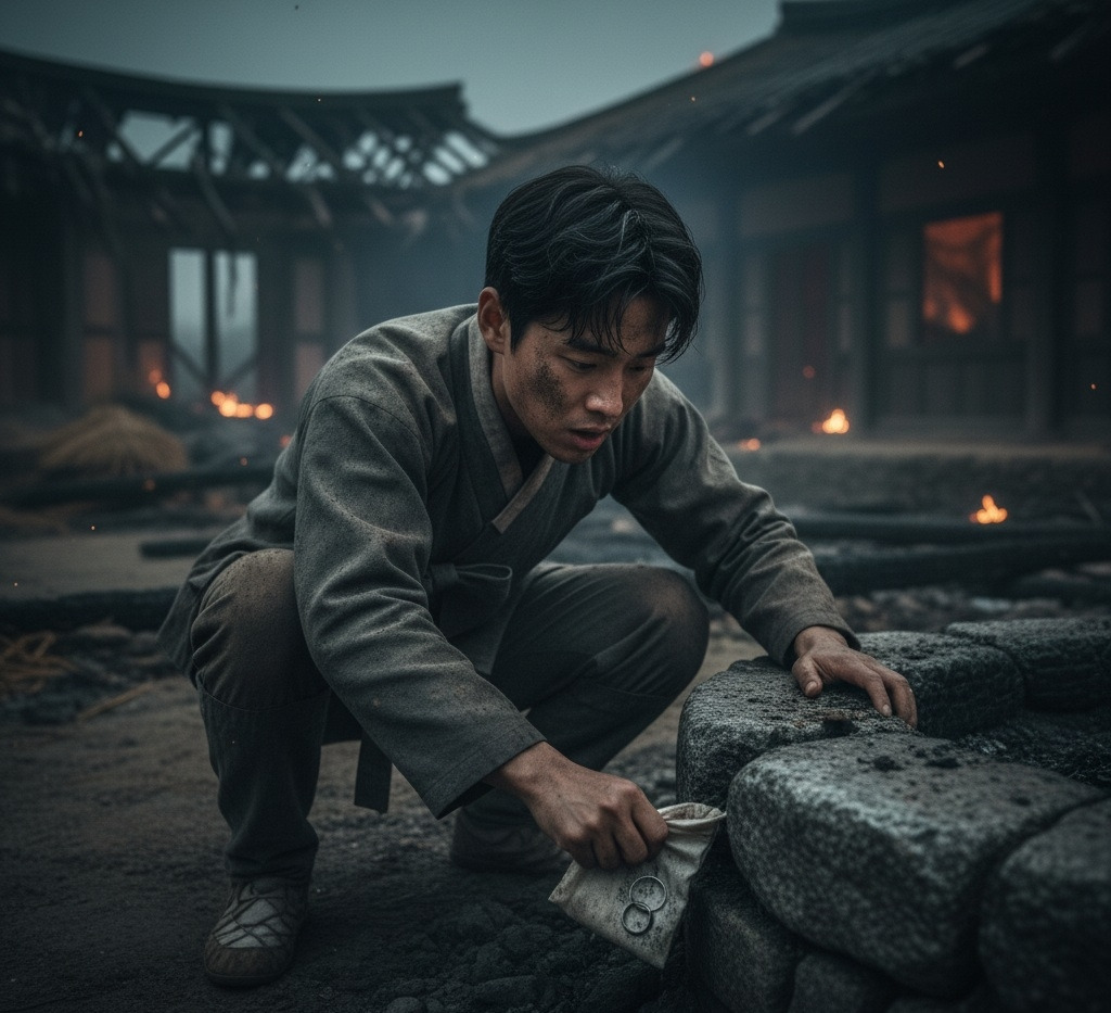 불타버린 학당터. 붕괴된 기둥의 잔해들 사이를 이산갑은 무겁게 걸어 들어갔다.재와 먼지로 얼룩진 얼굴에는 땀이 뒤섞였고, 그의 눈은 무언가를 찾는 듯 초점 잃지 않았다.이산갑은 혼잣말을 되뇌며 불에 그을린 돌무더기 사이로 몸을 낮췄다.겨우 형태를 알아볼 수 있는 주춧돌 아래, 손으로 잿더미를 헤치기 시작잠시 후, 무너진 돌 틈 사이로 작은 주머니 하나가 그의 손끝에 닿았다