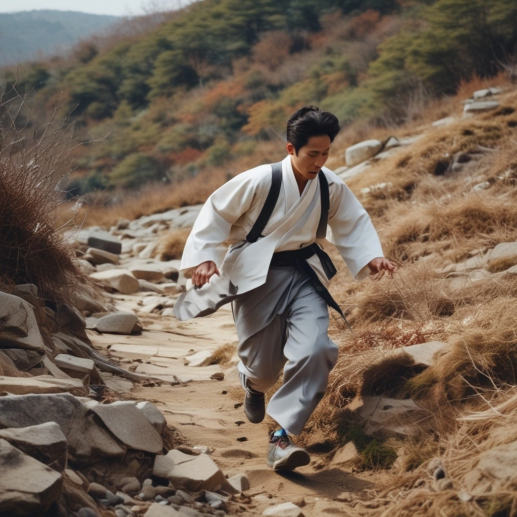 달리는 아래 돌멩이들이 굴러 떨어지고, 바람이 그의 얼굴을 스쳐 지나갔다. 나뭇가지들이 그의 옷자락을 붙잡으려는 듯 흔들렸다. 길은 이리저리 휘어져 있었고, 발목까지 쑥 빠지는 진흙이 그의 속도를 방해했다. 작은 돌멩이와 잡초가 길을 더욱 울퉁불퉁하게 만들었다그가 달려갈수록 연기는 더 짙어지고, 불길의 날카로운 타닥거림 소리가 귓가에 울리기 시작했다.
