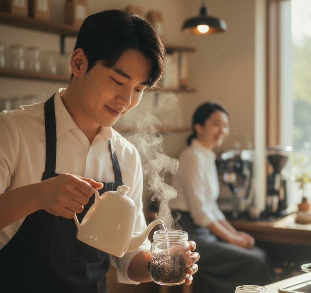 그는 조심스럽게 찻잎을 덜어내고, 뜨거운 물을 붓기 시작했다.